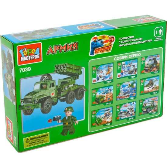 Конструктор ГОРОД МАСТЕРОВ KK-7039-R УРАЛ ракетная установкаКонструктор «УРАЛ: ракетная установка» ТМ «Город мастеров» с фигуркой вдохновит детей на новые сюжеты для игр. Собери военную ракетную установку, возьми фигурку военного и спеши на помощь военным!Такой оригинальный и яркий набор-конструктор станет гордостью игрушечной коллекции ребёнка. Пора порадовать маленького армейца мужским подарком. Защищать будем, конечно же, добро, любовь и семью – то есть, вас!Развивающий конструктор «УРАЛ: ракетная установка» ТМ «Город Мастеров» - это сразу 5 функций-преимуществ в 1-м конструкторе:- Игровой набор 2 в 1: играем, собирая конструктор + с получившейся игрушкой-машиной с ракетной установкой;- Реалистичная игрушка: ракетная установка стреляет снарядами - ребёнок будет в восторге!- В 120-ти деталях для сборки - скрывается целый военный мир для игр вашего ребёнка!- Удобный формат конструктора: его детали 100% совместимы с конструкторами со всего мира.- В наборе: 2 фигурки солдат + УРАЛ с ракетной установкой!С таким чудесным военным конструктором, ребёнок будет, играя, развивать:- Моторику;- Пространственное и логическое мышление;- Усидчивость и терпение, внимание;- Фантазию и воображение!Размеры конструктора: 25 * 16 * 5 см.Материал: пластмасса.Рекомендуем для детей от 4-х лет.