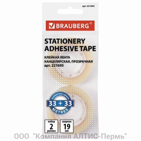 Клейкие ленты 19 мм х 33 м канцелярские BRAUBERG, комплект 2 шт., прозрачные, гарантированная длина, европодвес, 221695