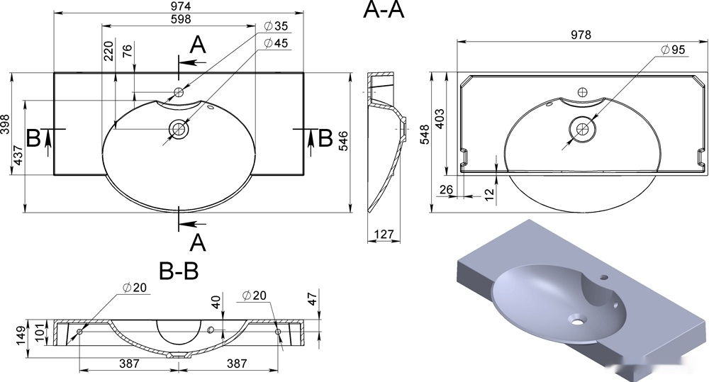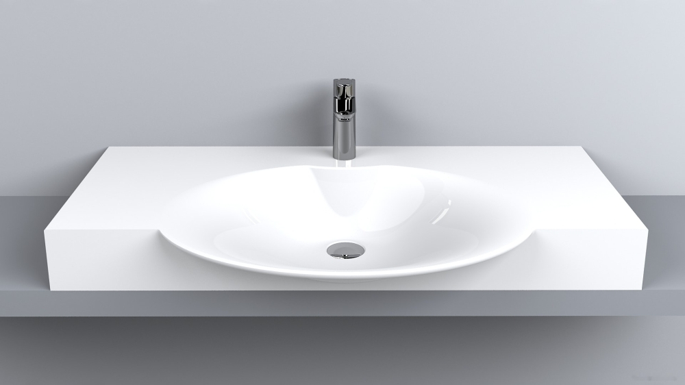 Умывальник врезной, на столешницу, ширина 978 мм, длина 548 мм, форма: нестандартная, искусственный мрамор, отверстие под смеситель.