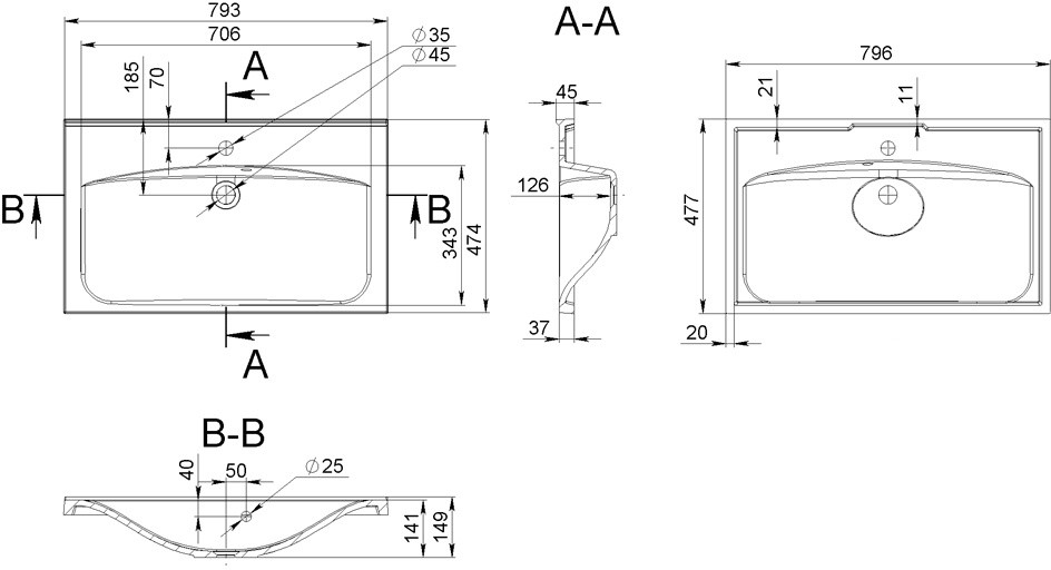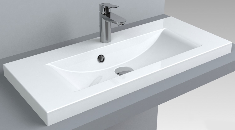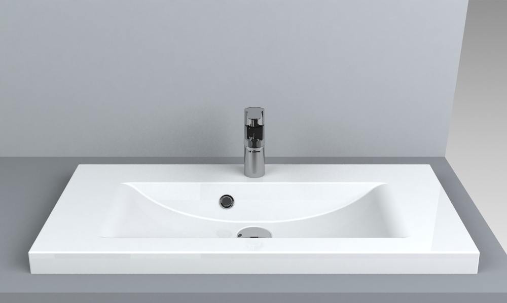Умывальник врезной, на столешницу, ширина 796 мм, длина 477 мм, форма: прямоугольная, искусственный мрамор, отверстие под смеситель, отверстие под перелив.