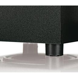Необычные формы колонок и оригинальная отделка сабвуфера привнесут стиль в интерьер вашей комнаты. Однако, кроме внешнего вида у модели есть ещё масса достоинств, обнаружив которые вы всерьёз и надолго влюбитесь в эту технику. Сателлиты выполнены в slim дизайне, устойчивые и компактные. Каждый из сателлитов оснащен широкополосным динамиком, воспроизводящим высокий и средний частотные диапазоны звука. Для защиты от внешнего воздействия они закрыты алюминиевой матовой решёткой, устойчивой к механическим повреждениям и удобной в быту. На левой боковой панели одного из сателлитов расположен регулятор уровня басов, а на правой - регулятор громкости звука. Сабвуфер типа фазоинвертор, с выходом на боковую панель. Выполнен из МДФ-плиты, отделан фактурным покрытием тёмно-серого цвета. Имеет форму перевёрнутого параллелепипеда, устанавливается на резиновые ножки 1,5 см. Динамик низкочастотной колонки выведен вниз. В верхней средней части лицевой панели чёрная глянцевая накладка.