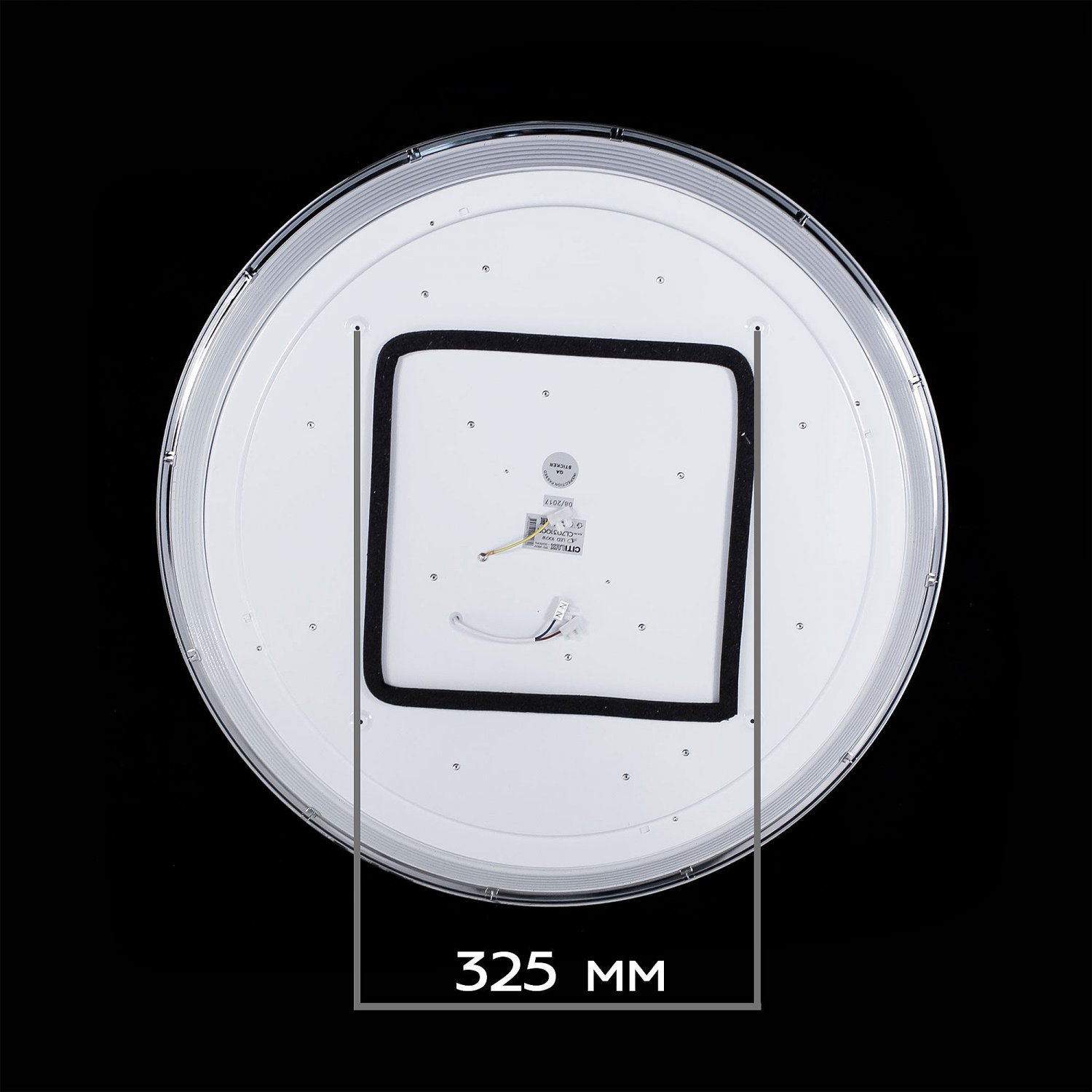 Технические особенностиДиаметр 67 см, Высота 10.5 см, светодиодный светильник с управлением с пульта и выключателя, регулировка яркости и цветовой температуры в широких пределах, функция ночника, красивейший эффект "хрустального" света.