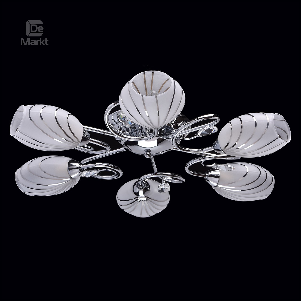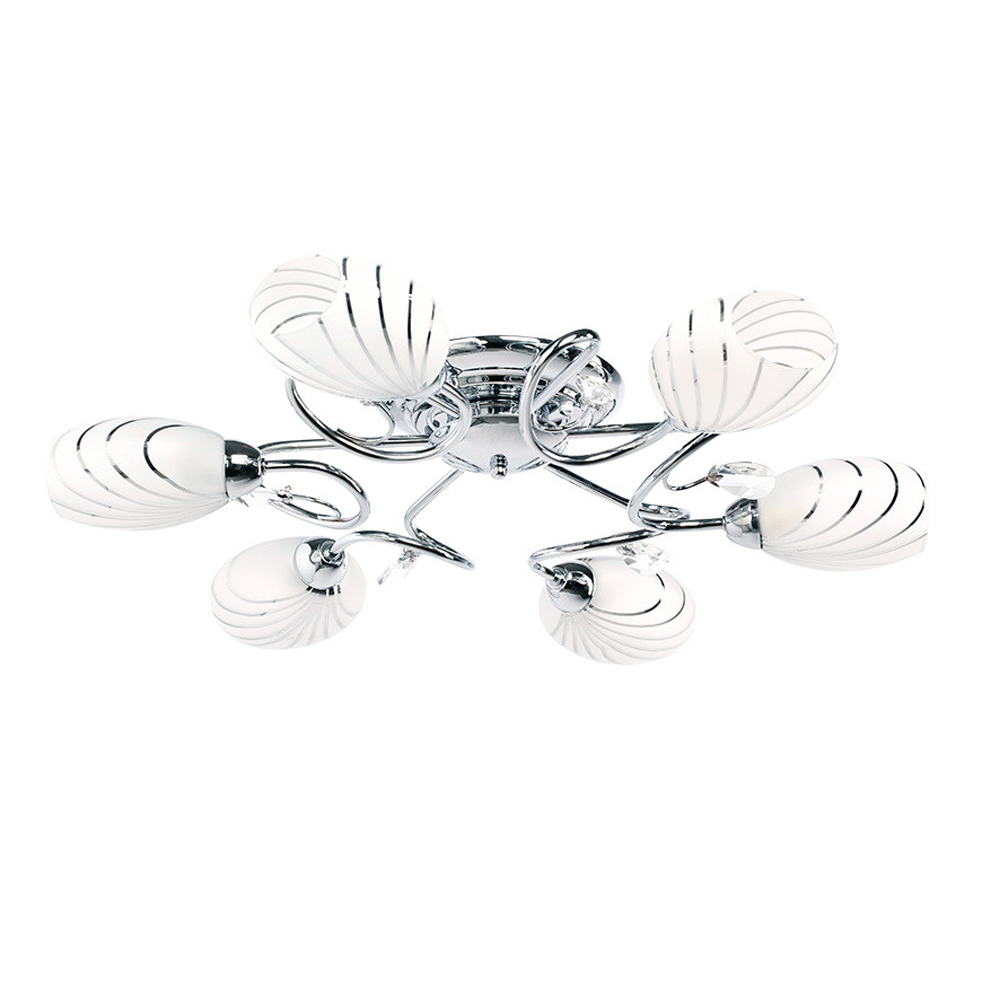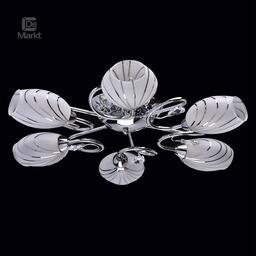 Преимущества моделиСовременный дизайн объединяет в себе популярную форму плафонов и оригинальные завитки арматуры. Универсальность модели – легко впишется практически в любой интерьер. Высокие параметры освещенности за счет светлых плафонов и их оптимального размещения по всему диаметру светильника. Качественное гальваническое покрытие арматуры цвета хрома. Демократичная цена. Хороший вариант для комнат со стандартными потолками.