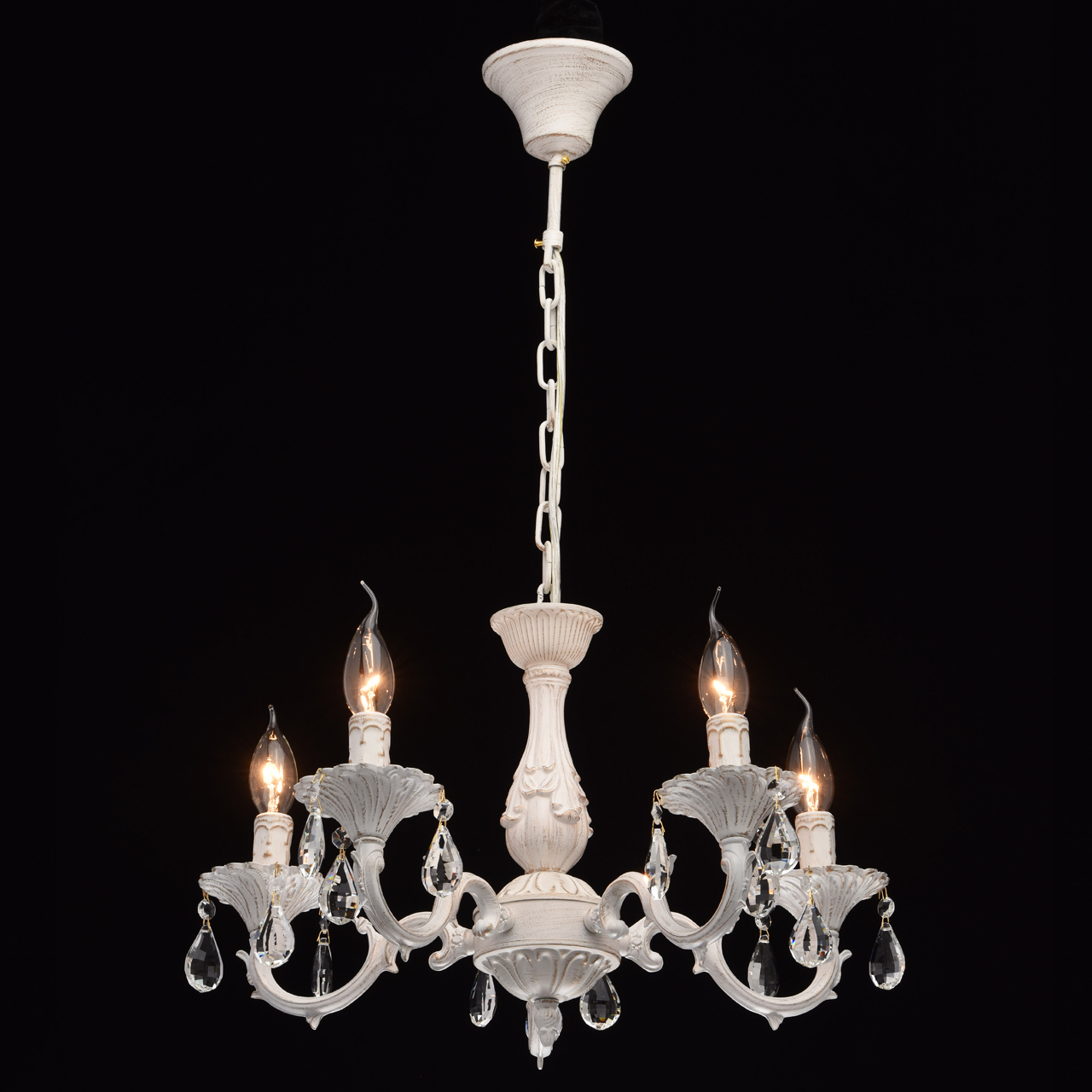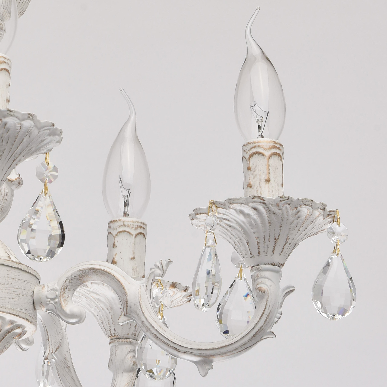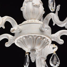 Технология производстваОснование: комбинация сплавов металлов, поверхность обработана по технологии двойного окрашивания - основной слой белый матовый, декоративный слой золотого цвета. Потолочная чаша: металл, обработка на токарном станке. Корпус, декоративные розетки, напатронники: металл, прессование. Рожки: сплав алюминия, художественное литье, Декор: подвески из прозрачного хрусталя миндалевидной формы и октагон.