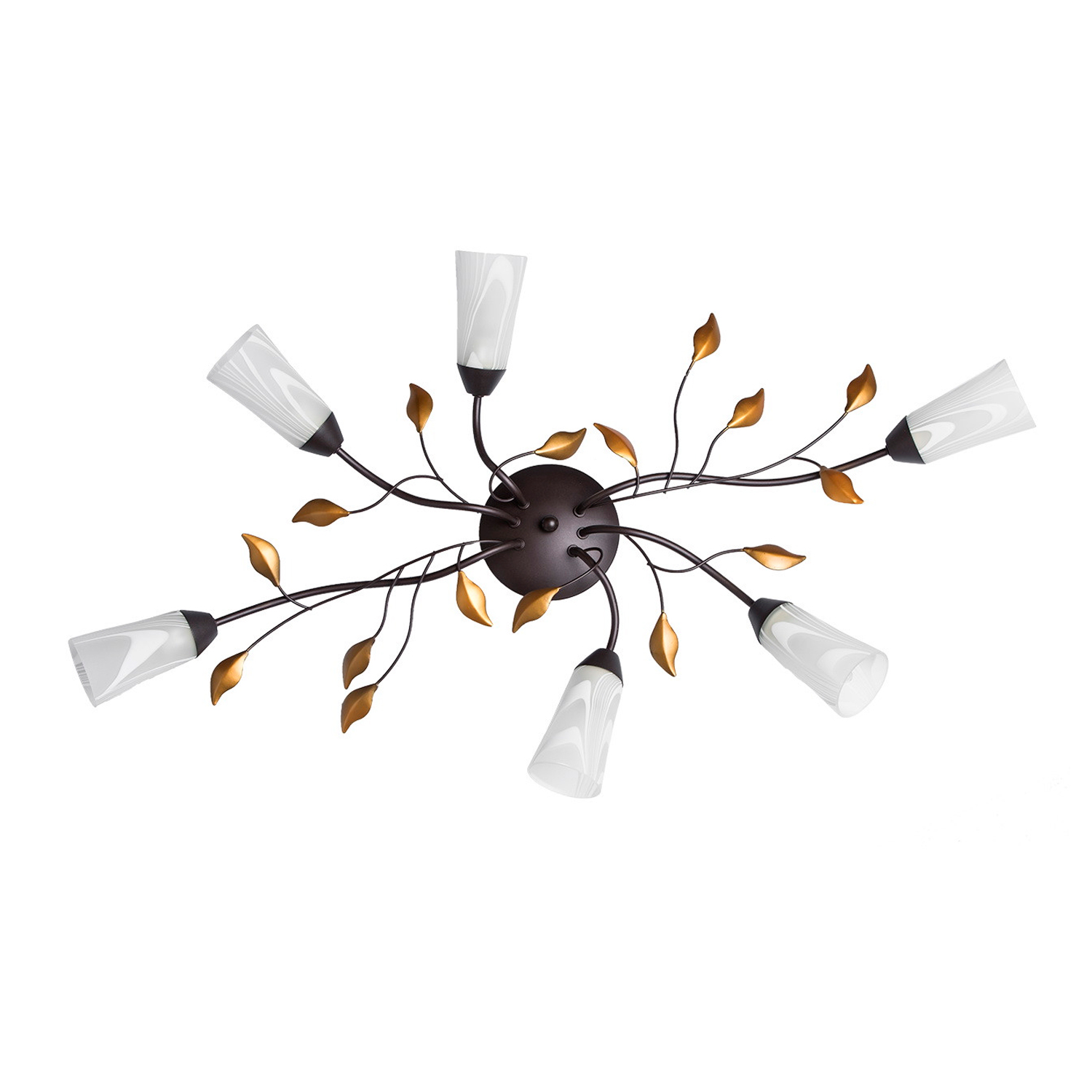 Технология производстваОснование: металл, окрашивание в коричневый цвет. Рожки и завитки выполнены по технологии проката на роликовом станке. Плафоны: стекло отлитое в форму, матирование, ручное окрашивание по поверхности. Декор: растительные элементы из металла, окрашивание в цвет золота.