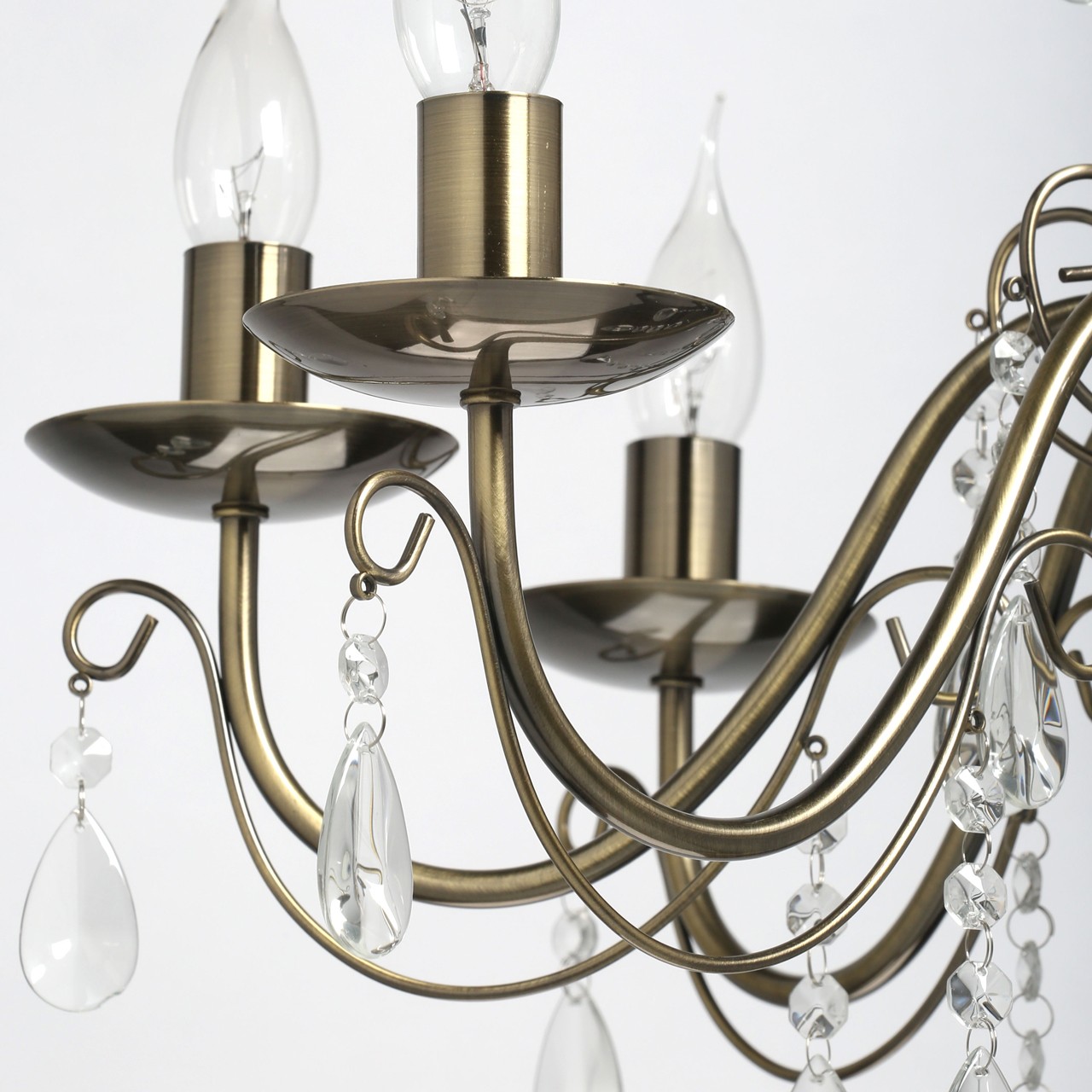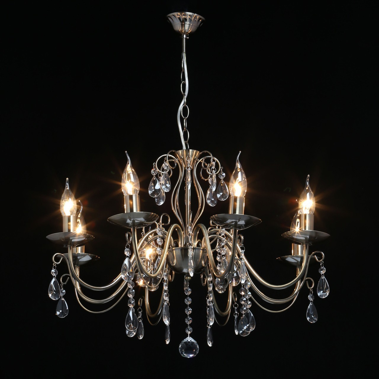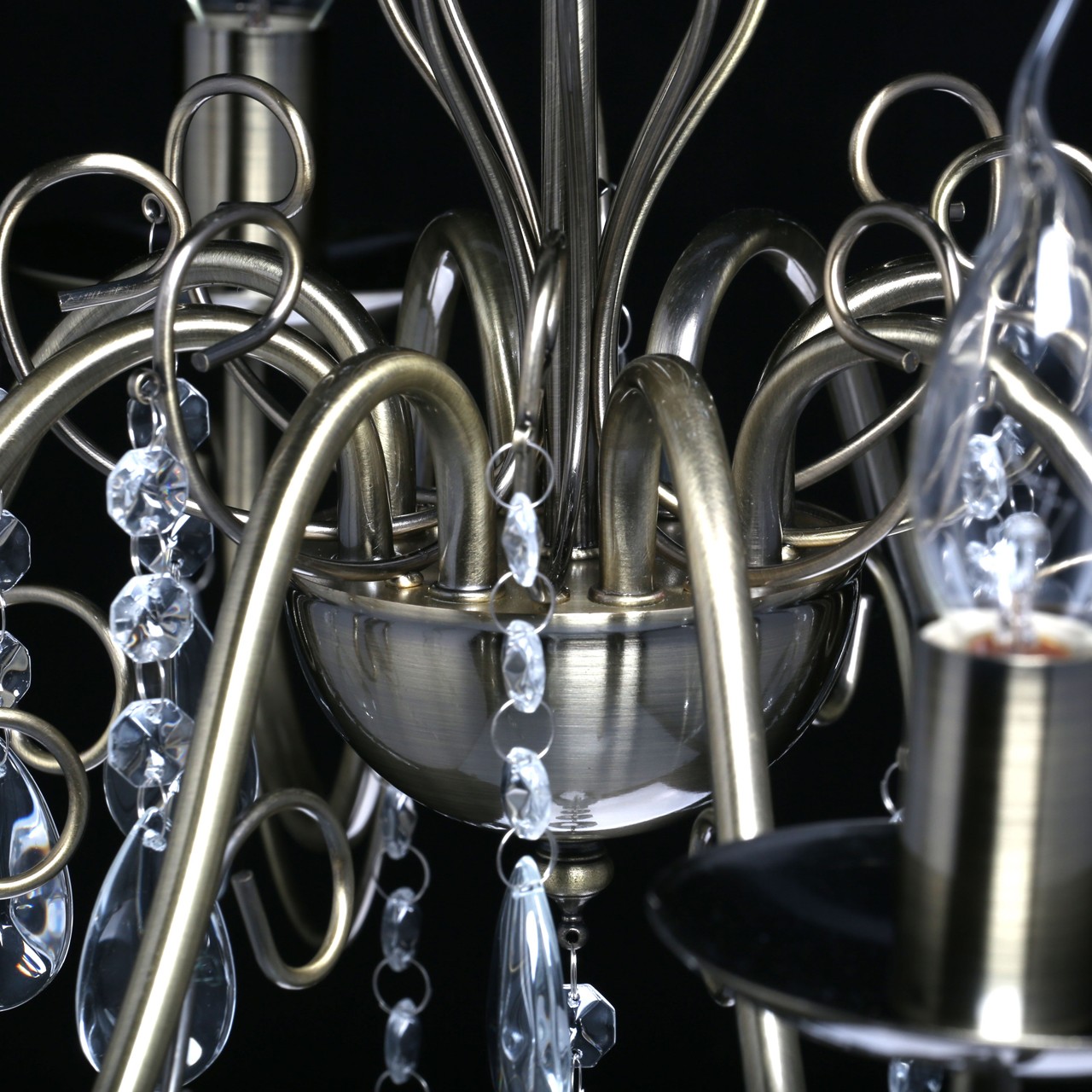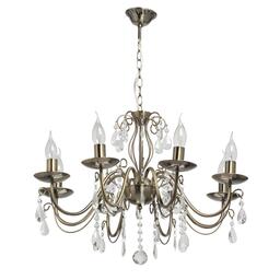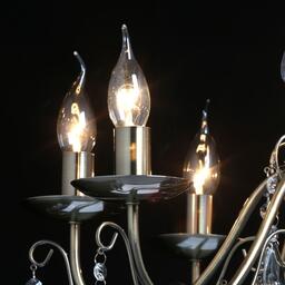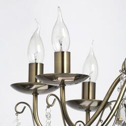 Преимущества моделиКлассическая форма рожков-свечей с основанием цвета античной бронзы. Декор из хрустального стекла создает игру света. Акцент в виде хрустального шара в центре композиции. Возможность регулировать высоту светильника, за счет звеньев цепи