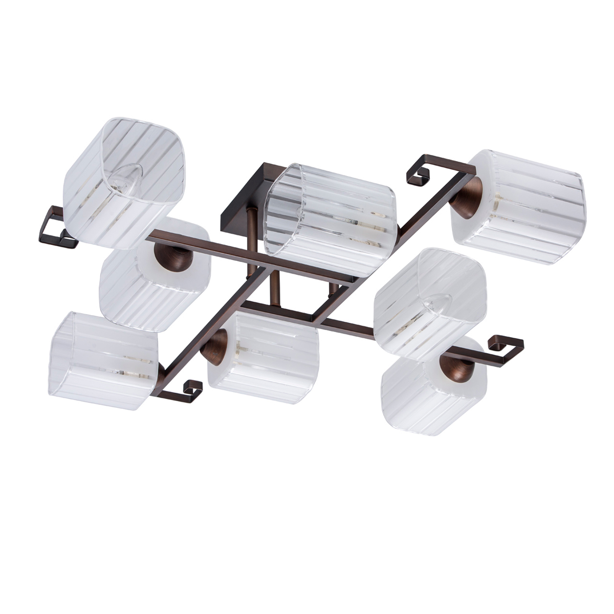 Преимущества моделиЛюстра выполнена в строгом геометричном стилеСтеклянные плафоны, повернутые в разные стороны, создают высокие параметры освещенияЛюстра выполнена в 2-х классических цветах: античной бронзы и темного кофе, что позволяет ей встроиться в разные цветовые решения интерьераБлизкое расположение к потолку дает возможность разместить люстру в помещениях со стандартными потолкамиДемократичная цена