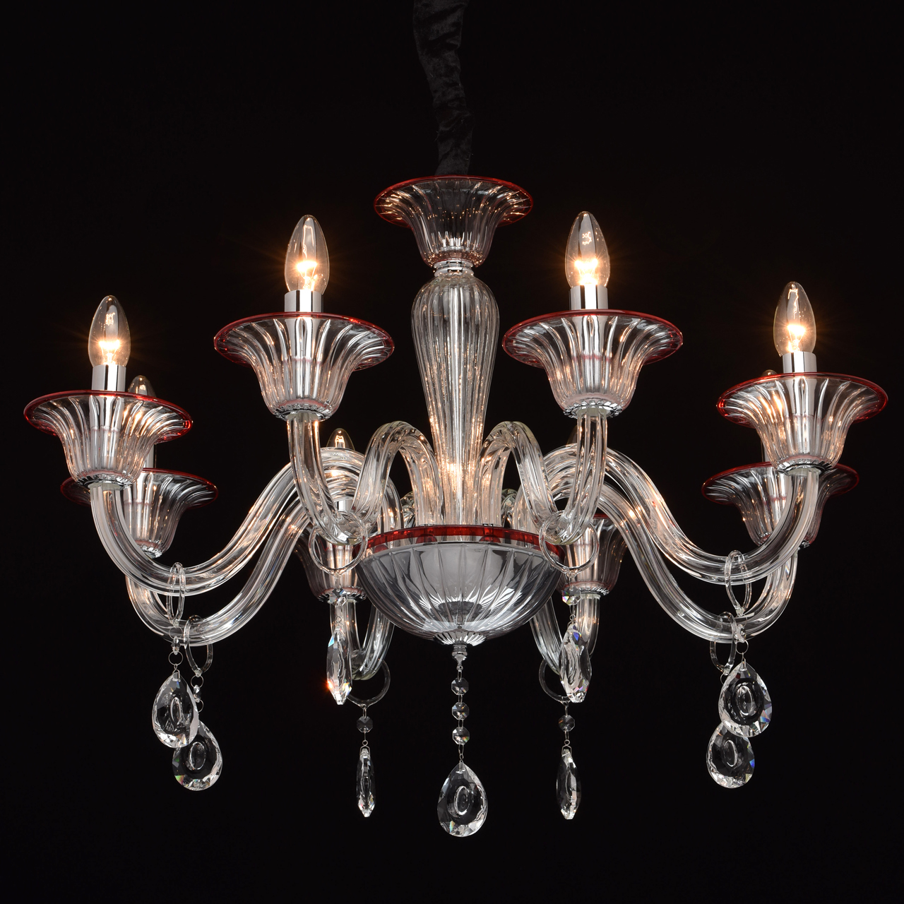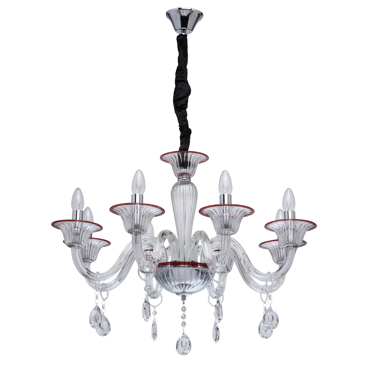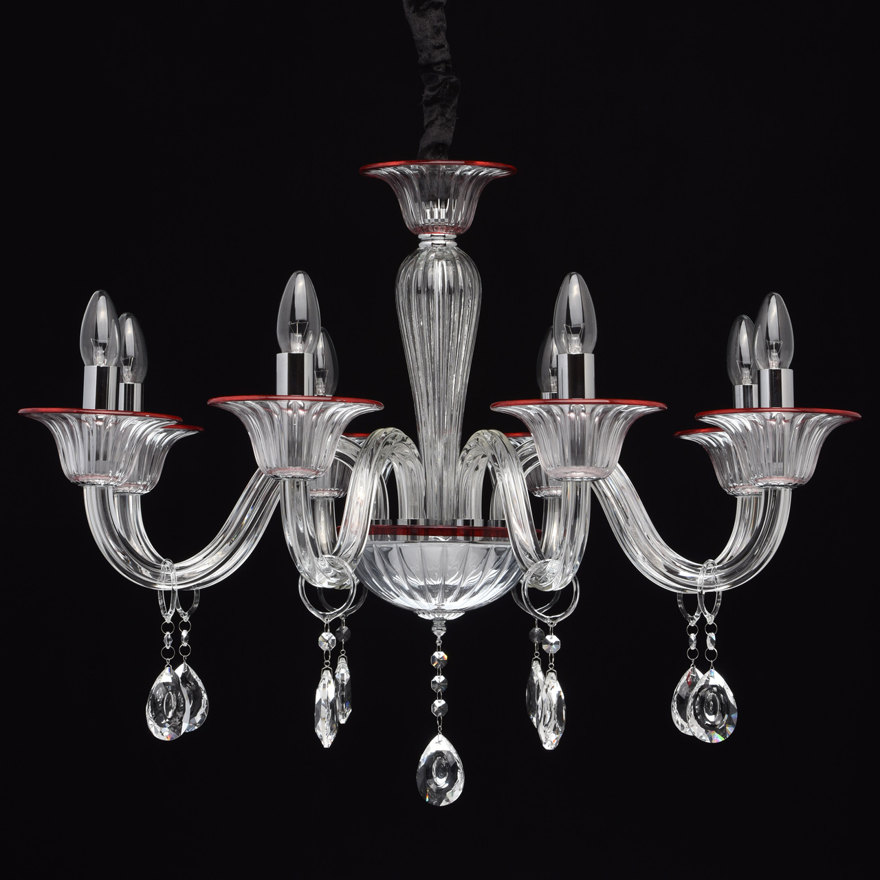 Технология производстваАрматура: основание светильника выполнено из стали и гальванизировано в цвет хром. Розетки и декоративные элементы центральной оси из толстостенного стекла отлиты в сложную форму. Рожки целиком выполнены из стекла. Декор: подвески из прозрачного хрусталя сложной формы. Кант красного цвета нанесен по краю декоративных розеток вручную.
