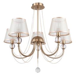 Преимущества моделиСъемные абажуры из органзы отлично пропускают свет. Полная семья, состоящая из люстр на 5 и 8 лампочек, бра и настольной лампы. Декор из цепочек, элементов из акрила создает дополнительные акценты в стиле ар-деко. Классический золотой цвет основания всегда в тренде.