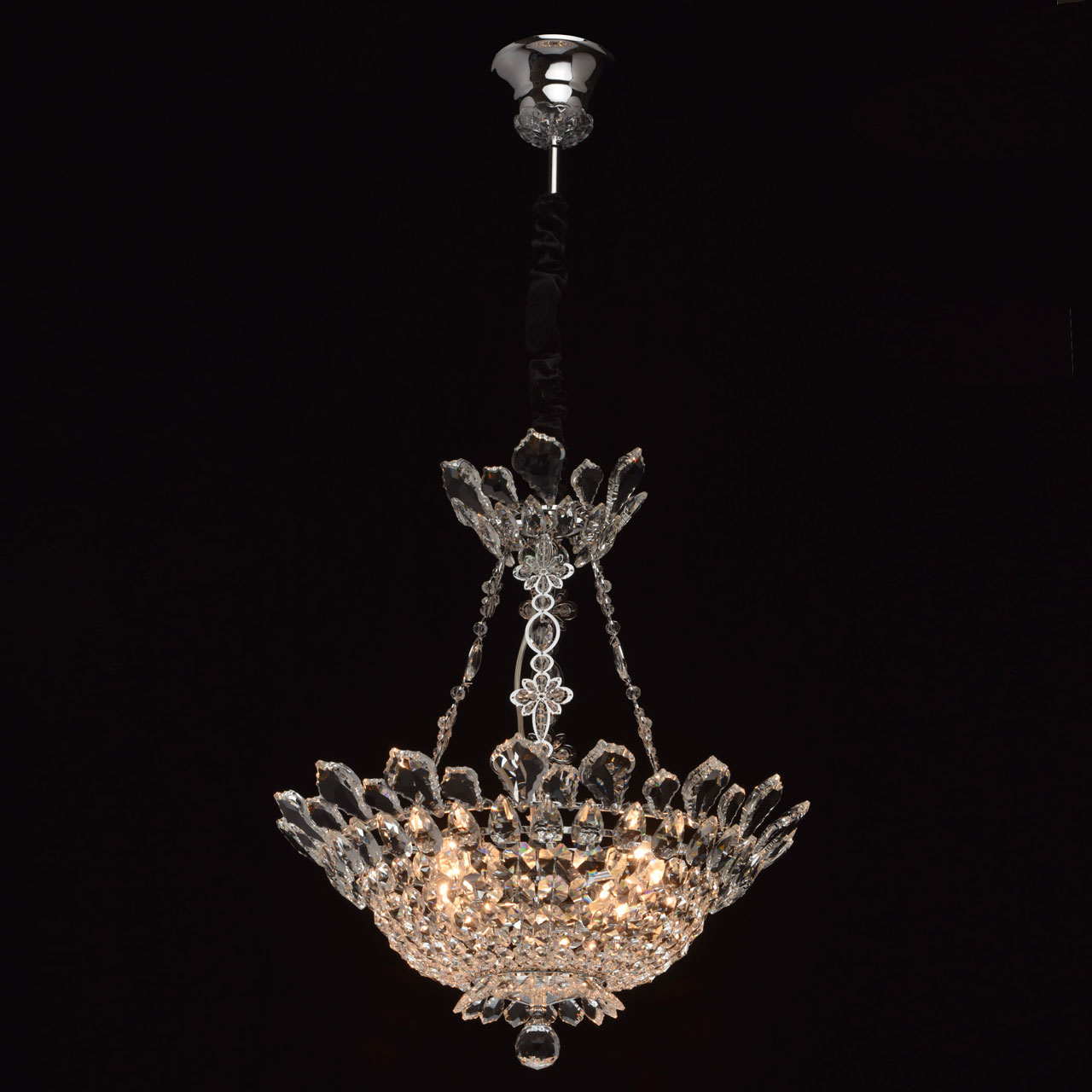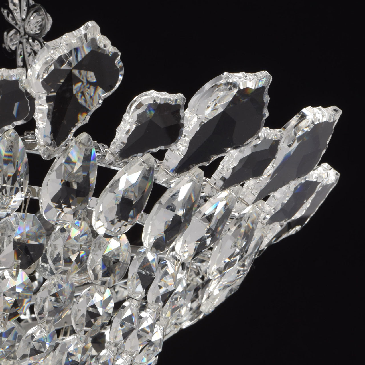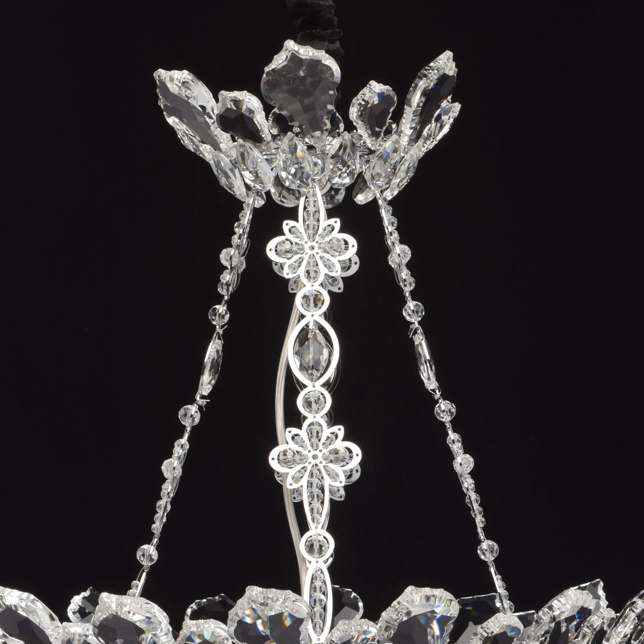 Технология производстваОснование: металл, гальванизация в цвет хрома. Плафон: металлический каркас в цвет основания, декорирован крупным прозрачным хрусталем различных форм и огранки. Для декора используется более 6 видов хрусталя. Декор: центральная декоративная розетка из массива хрусталя. Декоративные подвесы: из хрустальных бусин, собранных во флористическую композицию.