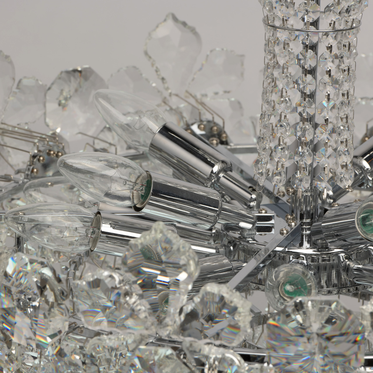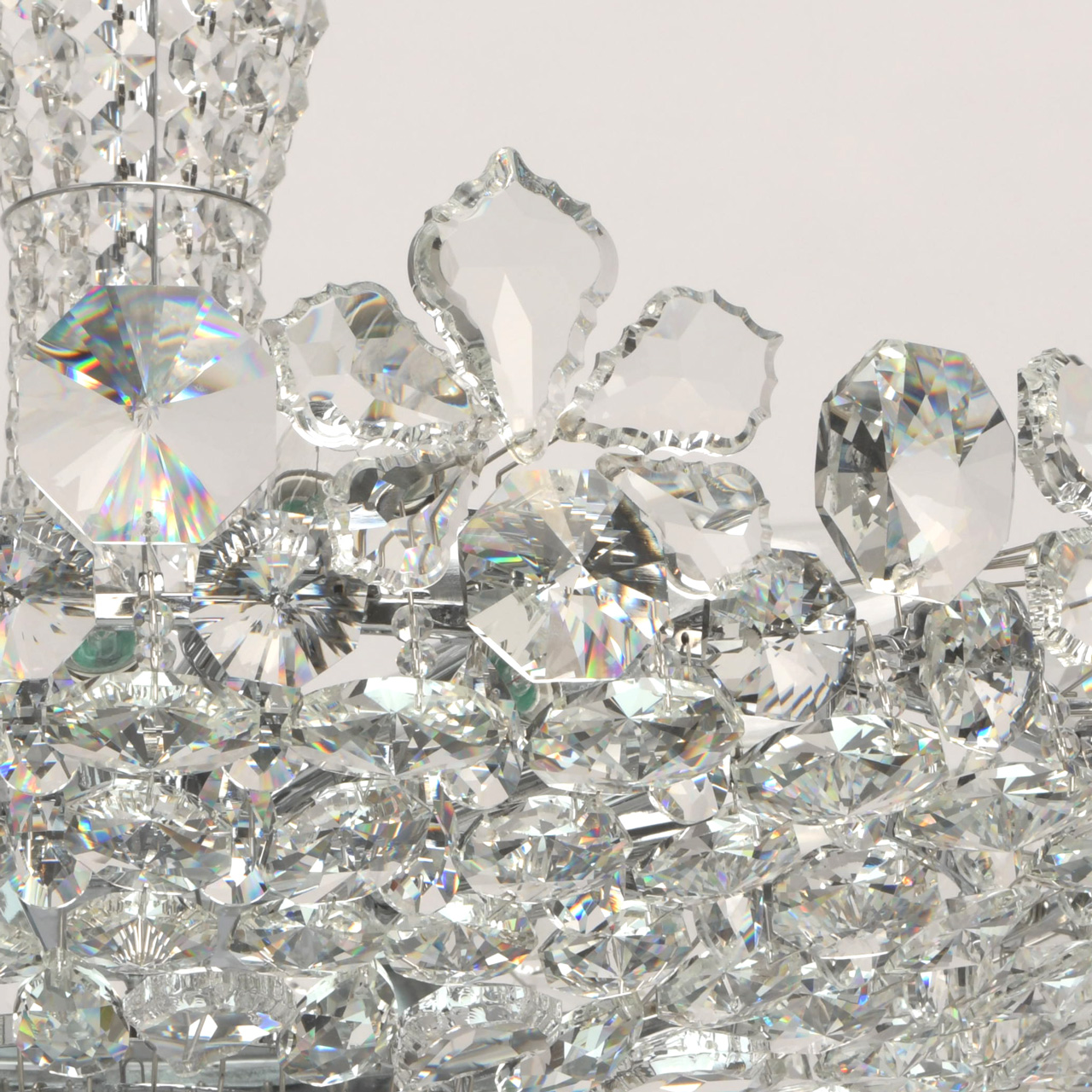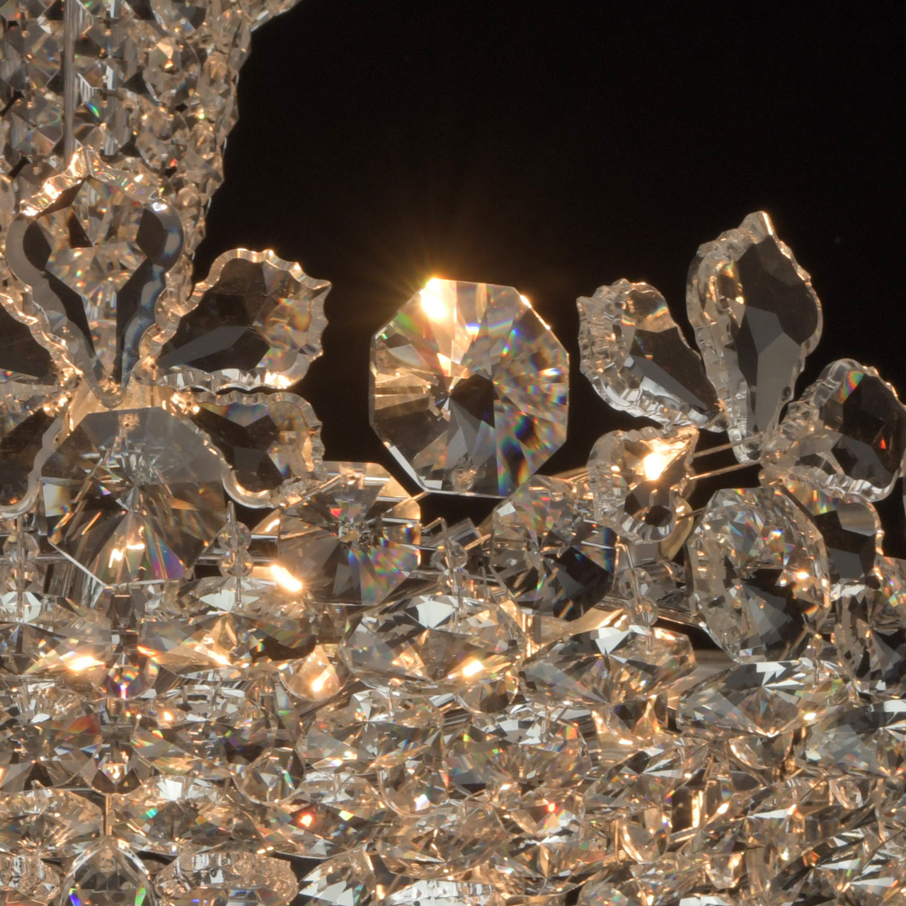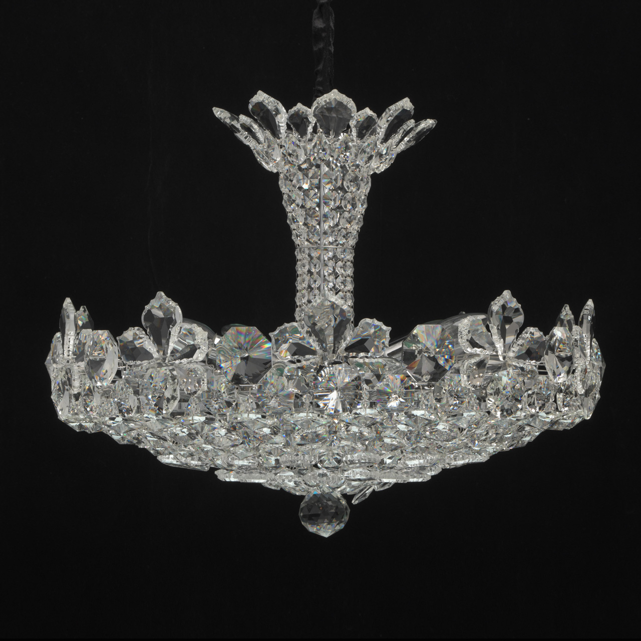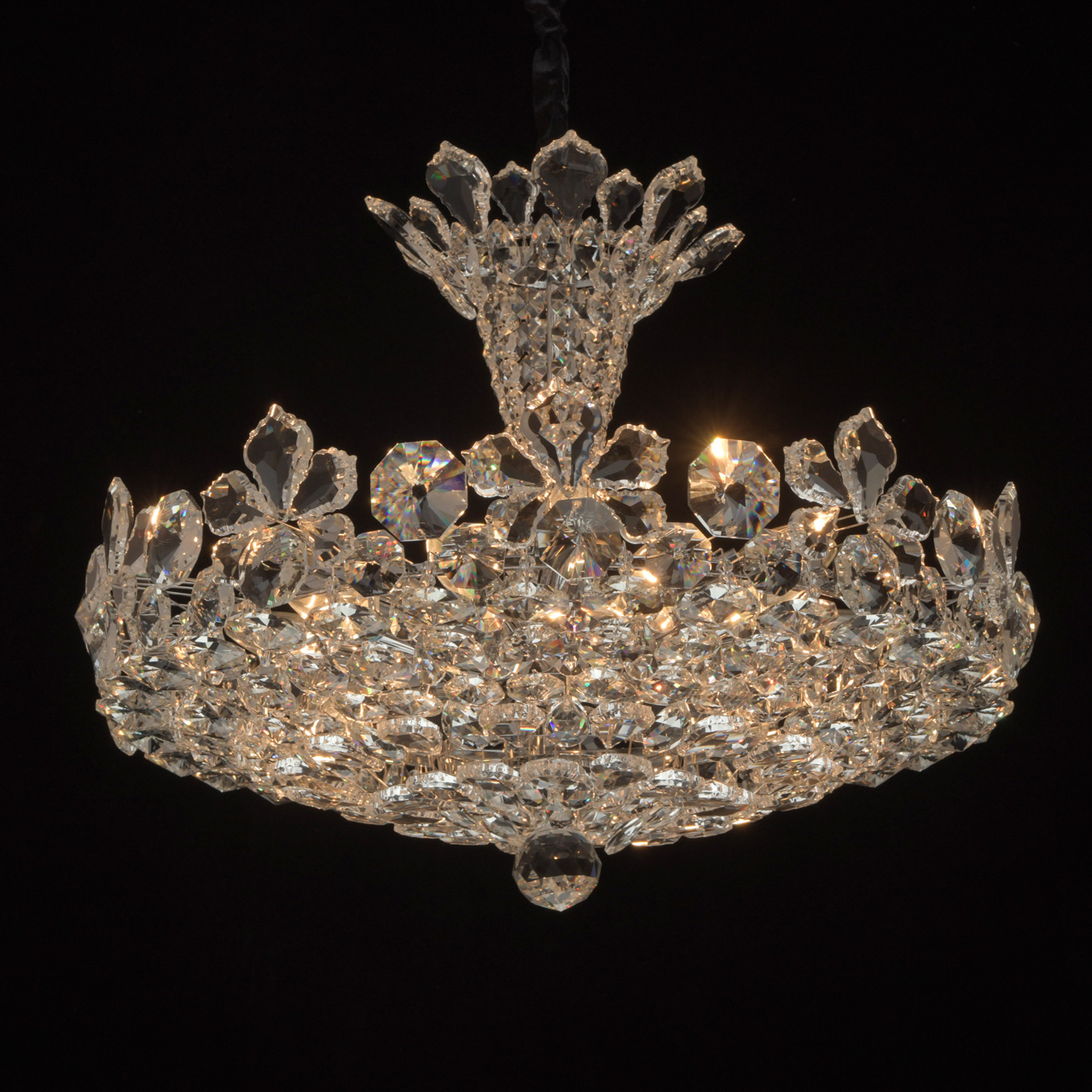 Технология производстваОснование выполнено из металла, гальванизировано в цвет хрома. Потолочная чаша: обработка на токарном станке. Светильник декорирован прозрачным хрусталем высшей категории формы дубовый лист, миндаль, октагон, шар.