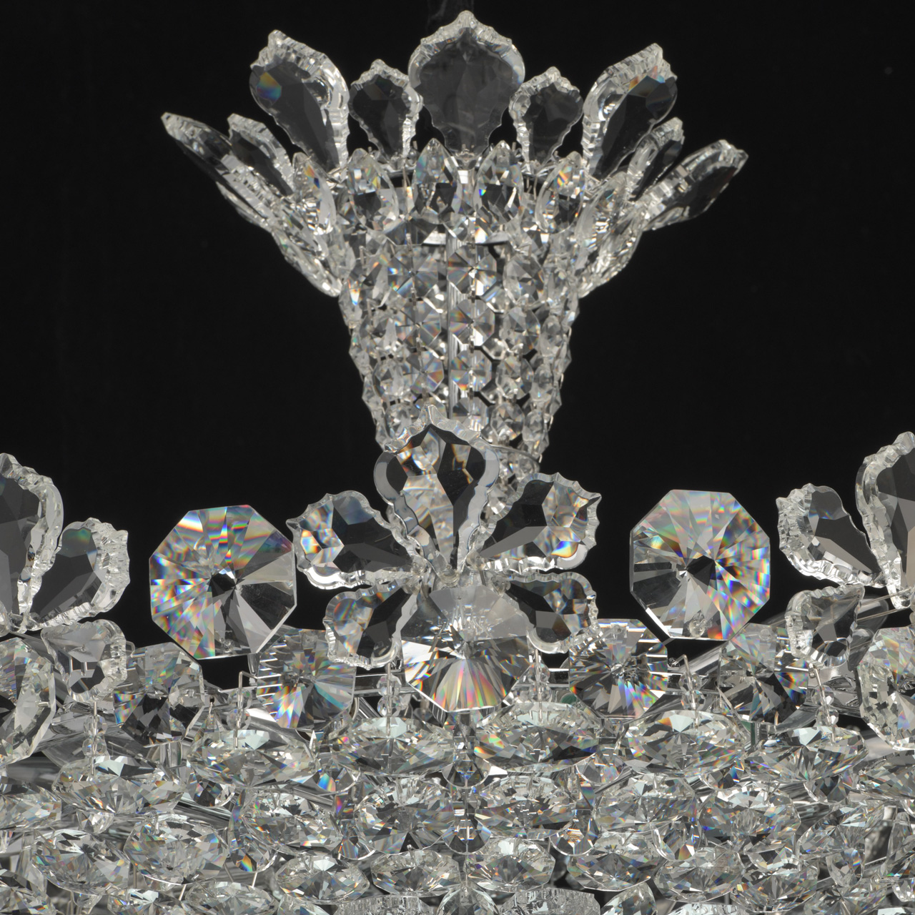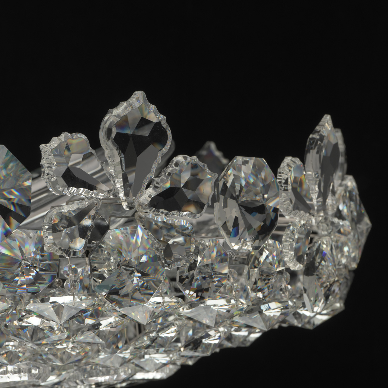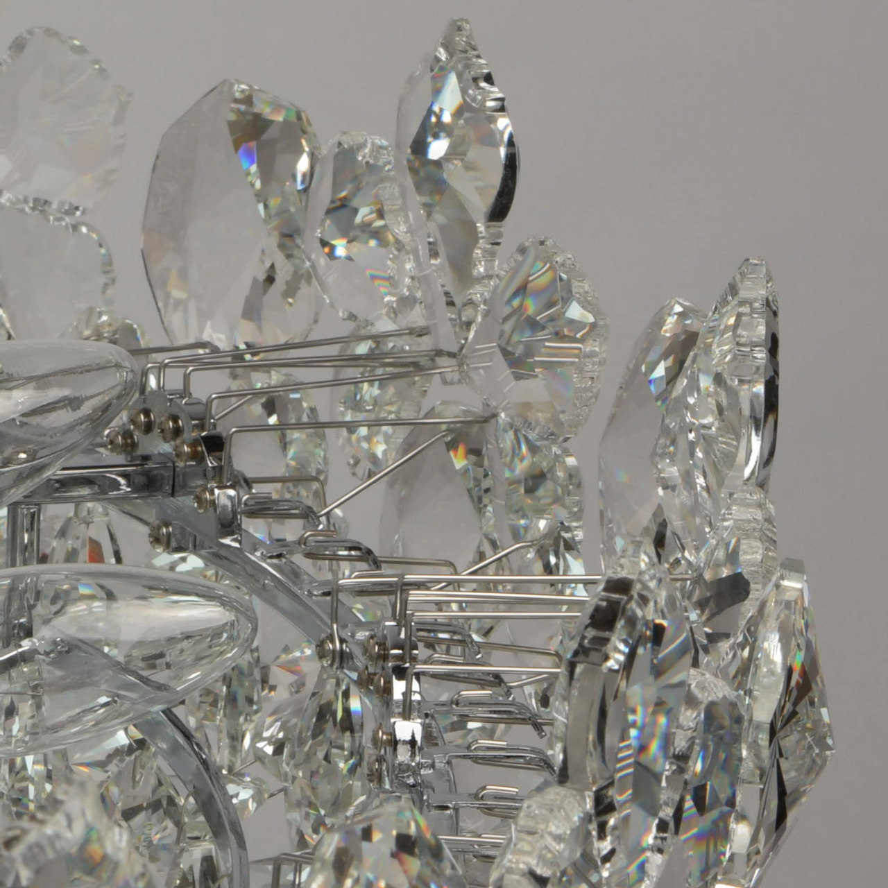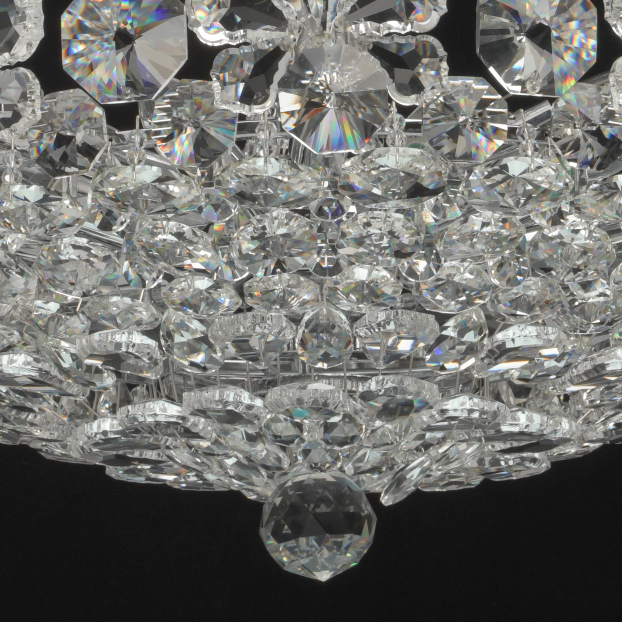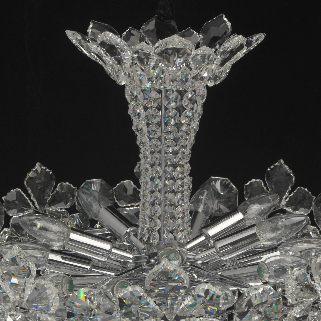 Технология производстваОснование выполнено из металла, гальванизировано в цвет хрома. Потолочная чаша: обработка на токарном станке. Светильник декорирован прозрачным хрусталем высшей категории формы дубовый лист, миндаль, октагон, шар.