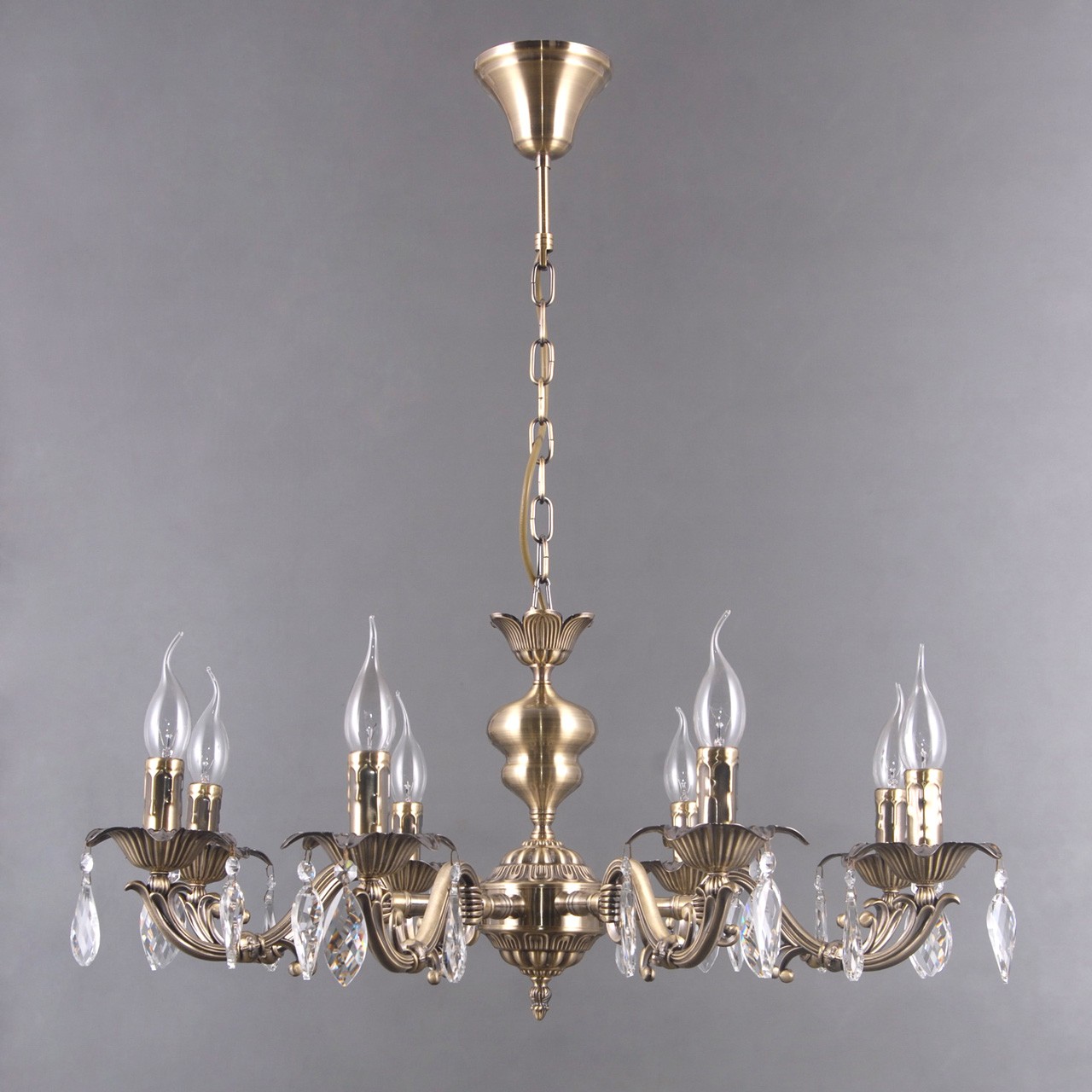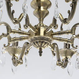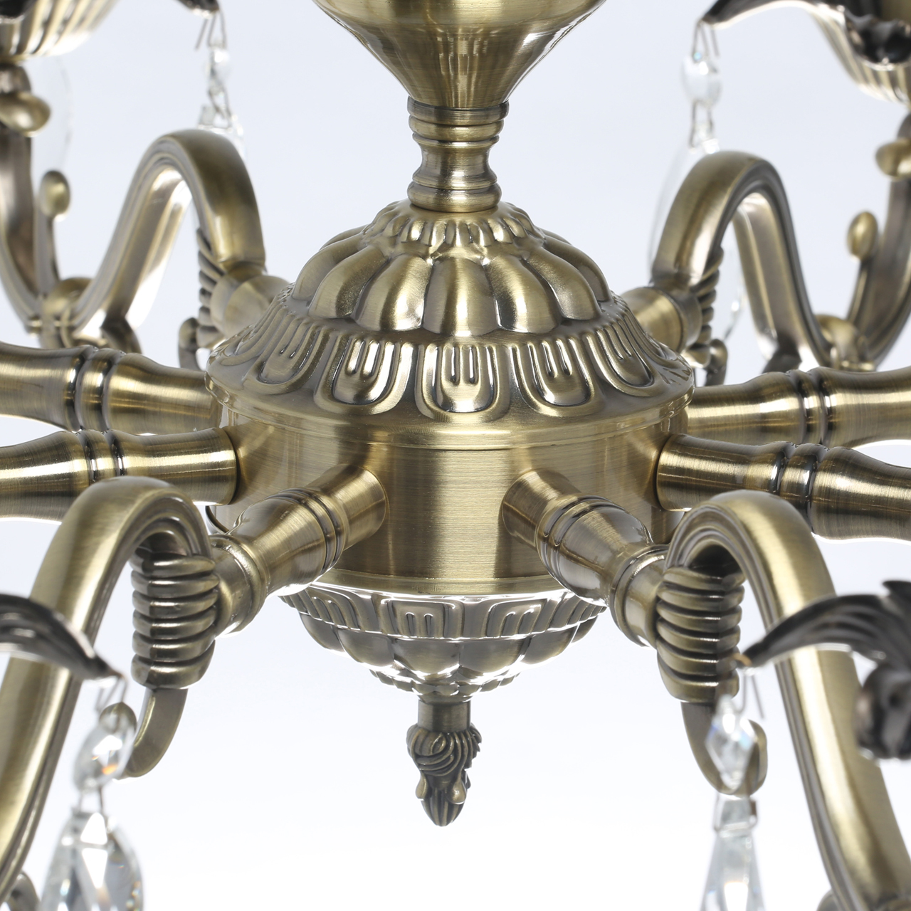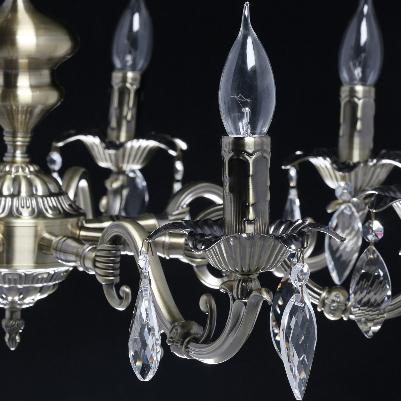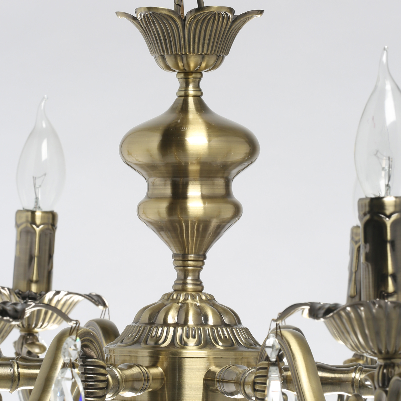 Преимущества моделиКлассическая форма свечи цвета античной бронзы со старинной патиной для интерьеров в традиционном стиле. Хрустальные подвески на резной розетке придают легкости конструкции. Декор художественного литья на рожках и основании модели. Возможность регулировать высоту светильника за счет звеньев цепи.