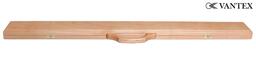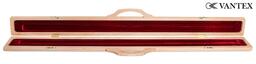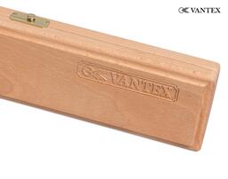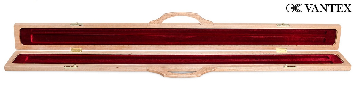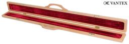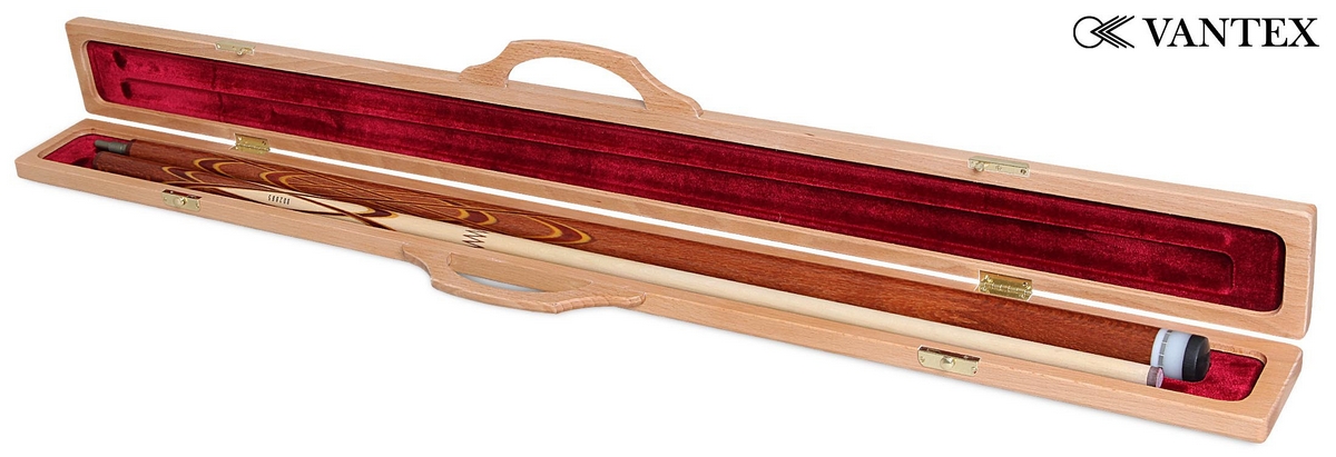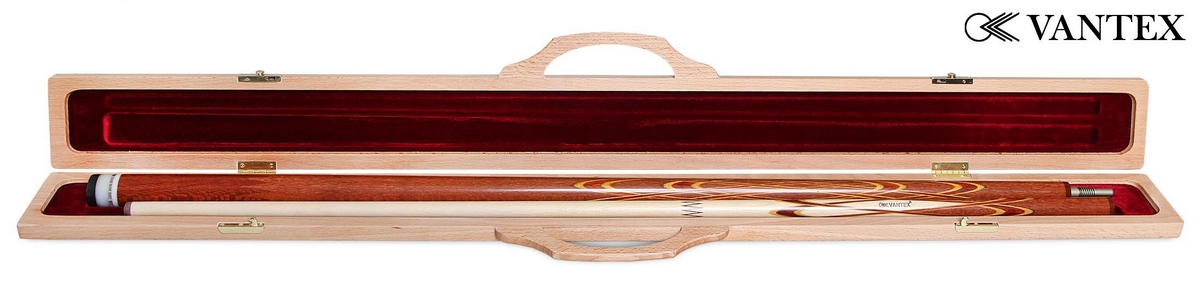 Кейс рассчитан на хранение одного двусоставного кия, внутри расположены два отделения: для шафта и турняка. Внутренние поверхности обтянуты красивой бархатной тканью красного цвета. Рукоятка кейса изготовлена из древесины. Крышка откидывается на металлических петлях, закрывается на металлические замки. Кейс Vantex предназначен для транспортировки и защиты кия от влаги, перегрева и царапин.
