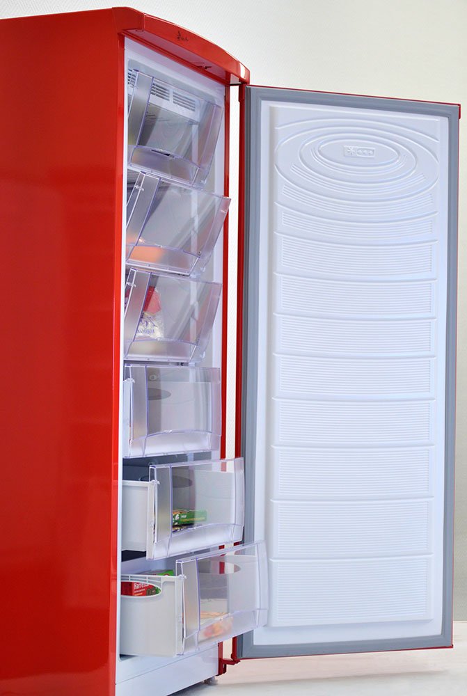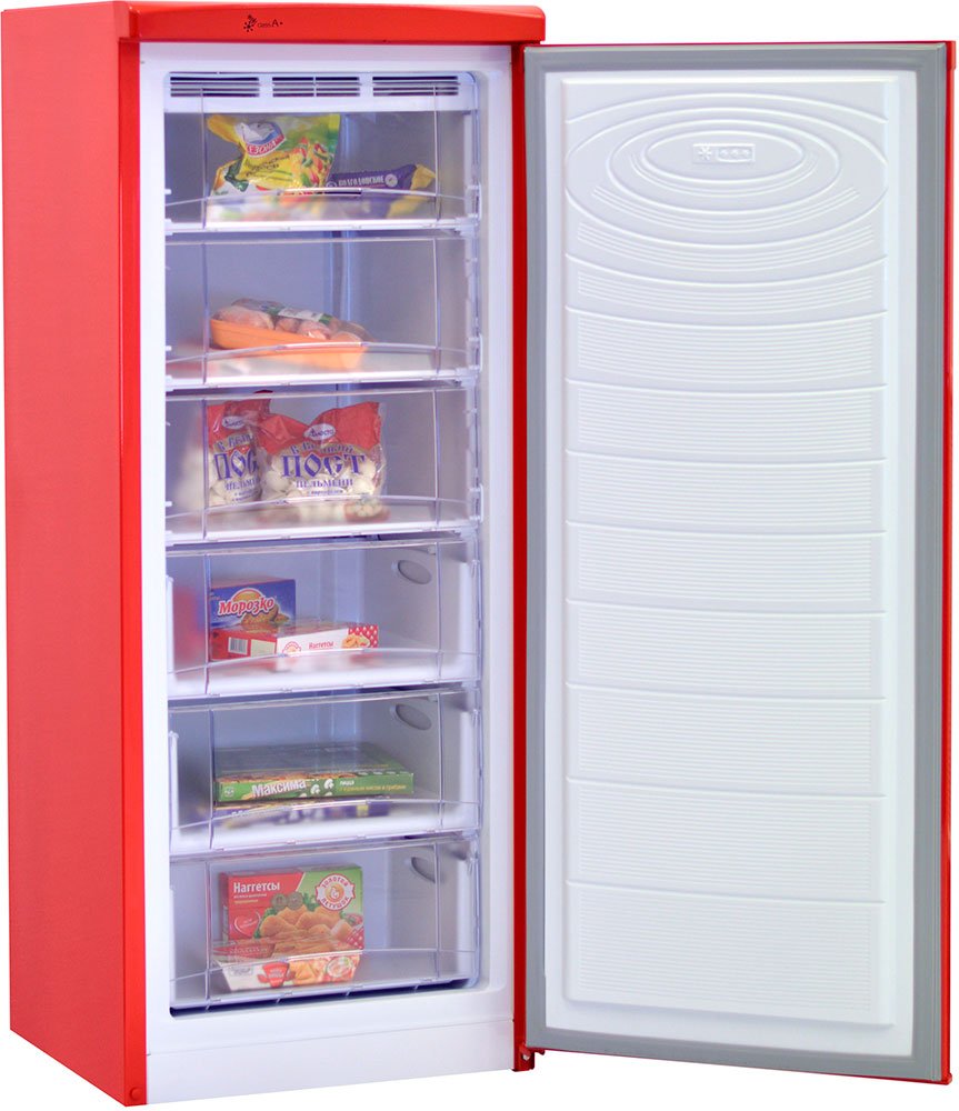 Морозильный шкаф; электромеханическое управление; класс энергопотребления A+; полезный объем 152 л; количество отделений 6; мощность замораживания 12 кг/сутки; количество компрессоров 1; цвет красный.