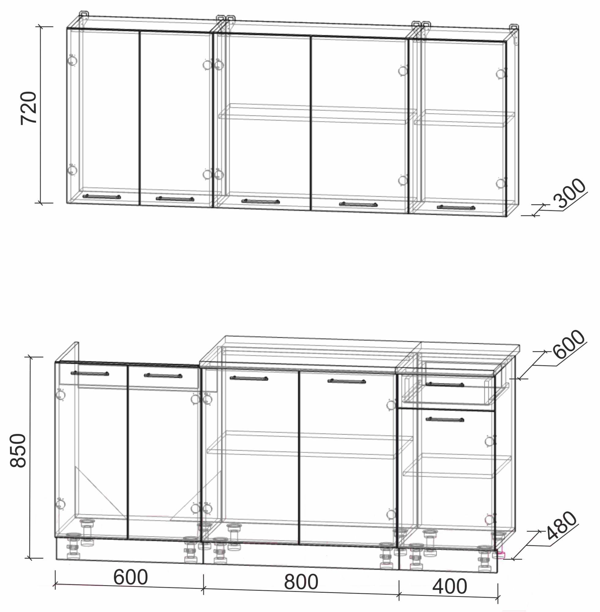 • Глубина нижних шкафов 60 см (48 см — глубина по корпусу)