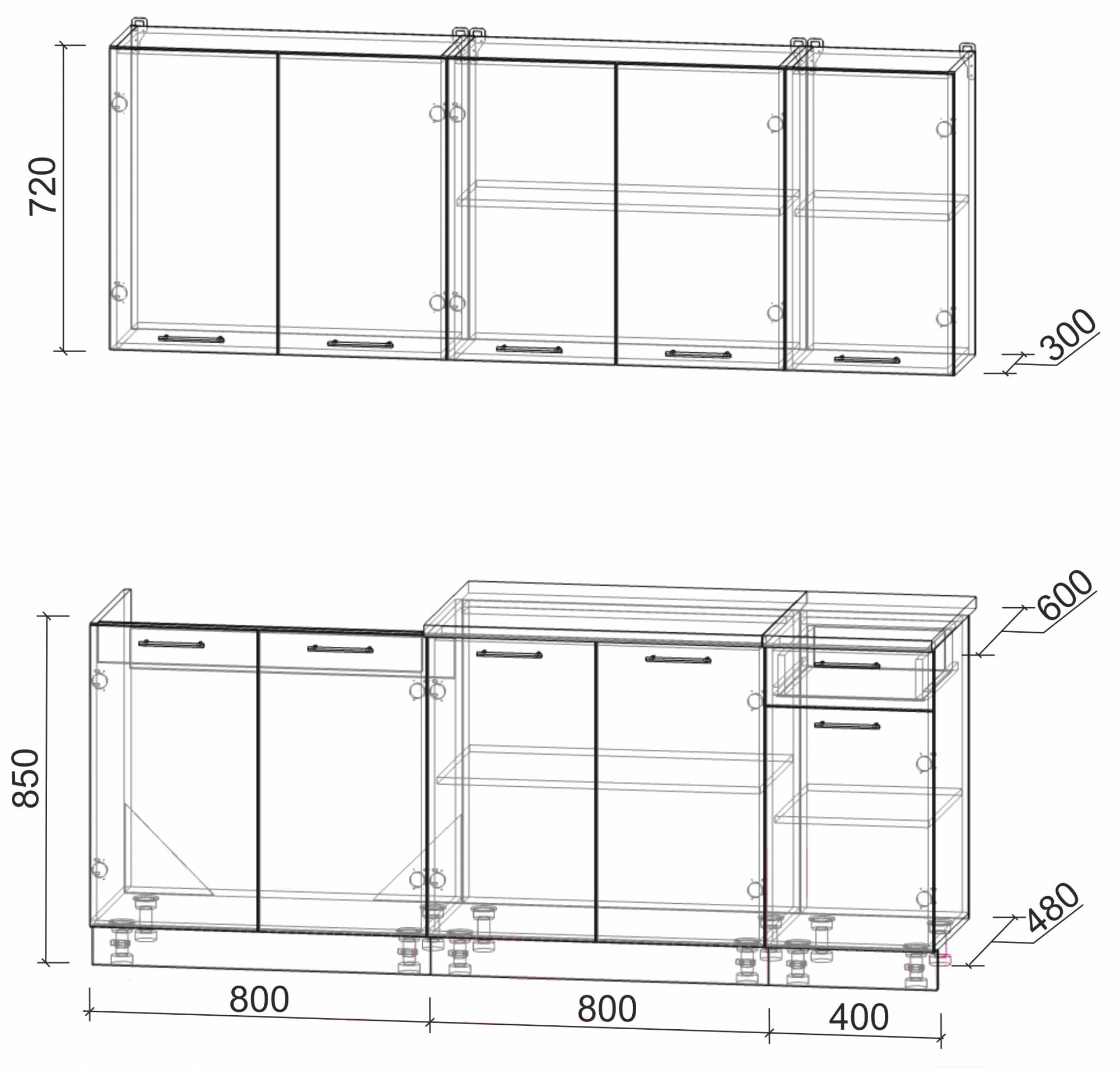 • Глубина нижних шкафов 60 см (48 см — глубина по корпусу)