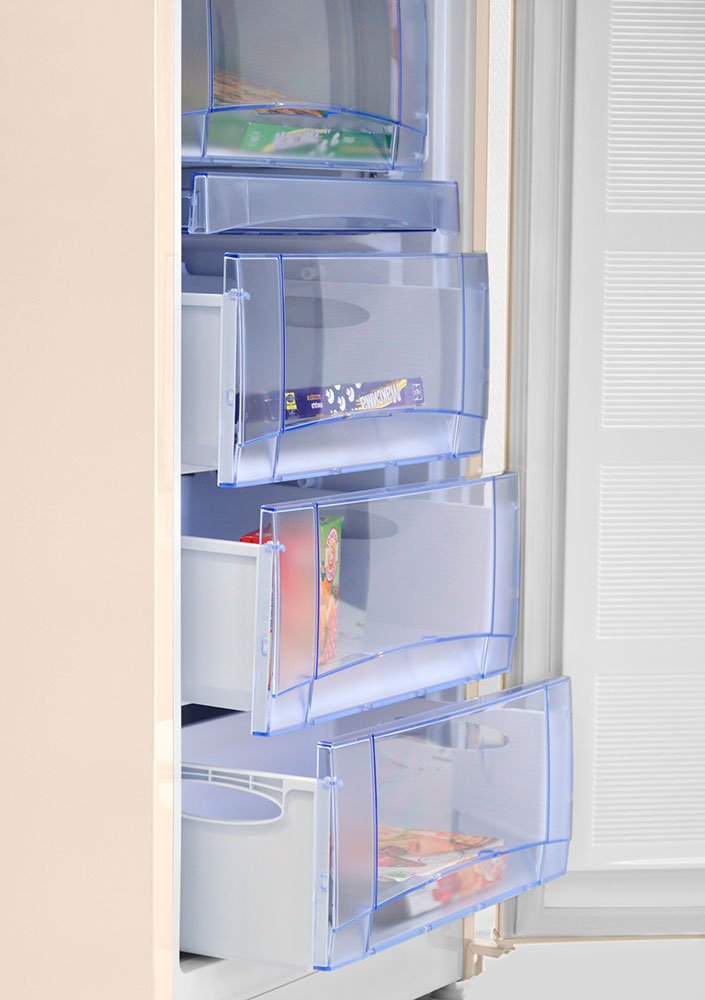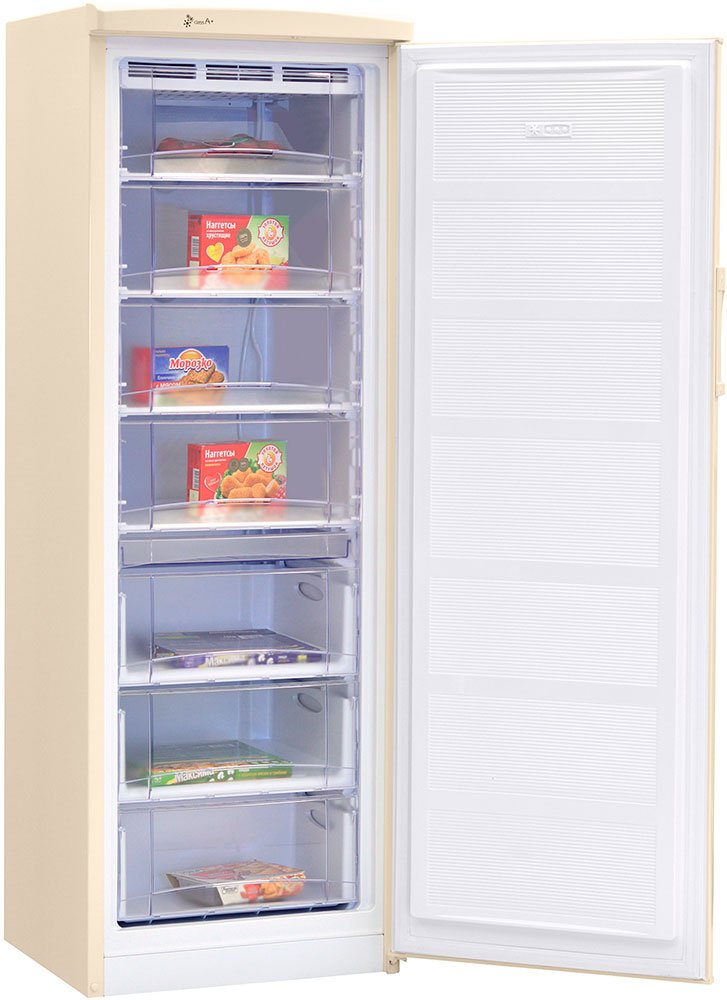 Морозильный шкаф; электромеханическое управление; класс энергопотребления A+; полезный объем 210 л; количество отделений 7; мощность замораживания 16 кг/сутки; количество компрессоров 1; цвет бежевый.