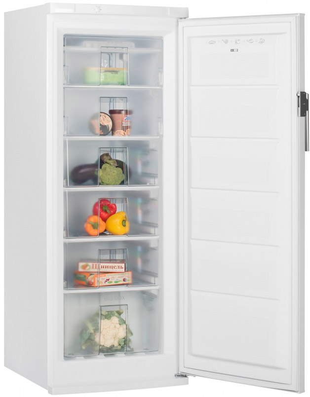Морозильный шкаф; электромеханическое управление; класс энергопотребления A; полезный объем 206 л; количество отделений 6; мощность замораживания 24 кг/сутки; количество компрессоров 1; режим суперзаморозки; цвет белый.