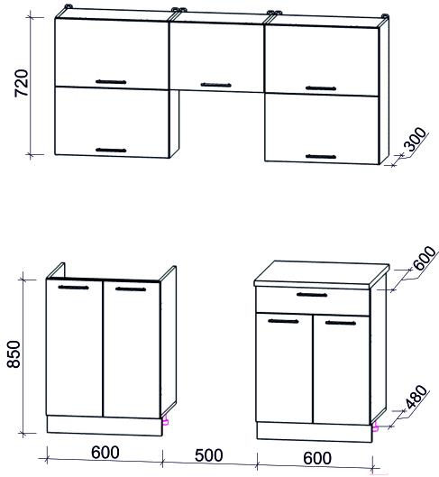 - Глубина нижних шкафов 60 см (46 см - глубина по корпусу)