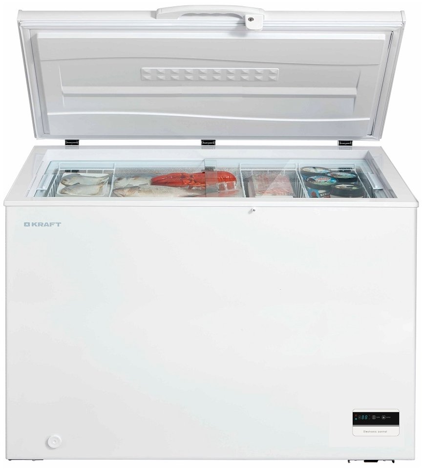 Морозильный ларь; электронное управление; класс энергопотребления A; полезный объем 300 л; количество отделений 1; мощность замораживания 14 кг/сутки; количество компрессоров 1; режим суперзаморозки; цвет белый.