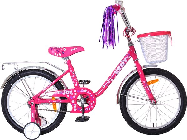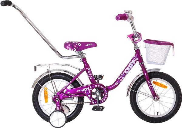 Велосипед для девочек 3-5 лет. 1 скорость. Стальная рама. Жесткая вилка. Диаметр колес: 14". Задний ножной тормоз. Эргономичное сиденье. Руль с регулировкой по высоте и углу наклона. Родительская ручка. Приставные колеса. Защита цепи. Крылья. Багажник. Звонок. Корзина на руле. 2 цветовых варианта.