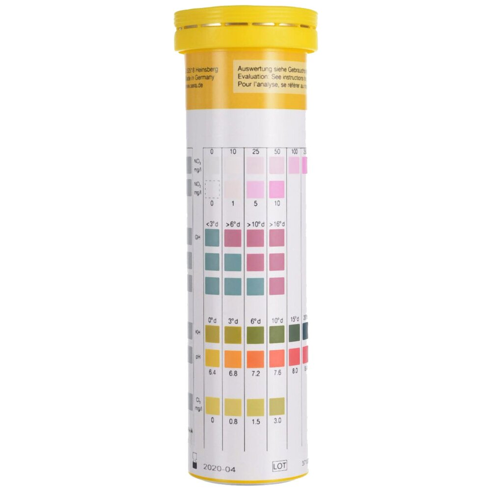 - Способ применения поместите тест-полоску в воду на 1 секунду, отряхните от воды и подождите минуту до проявления цвета; сравните получившиеся цвета на тест-полоске с цветовой шкалой на контейнере (при дневном освещении)