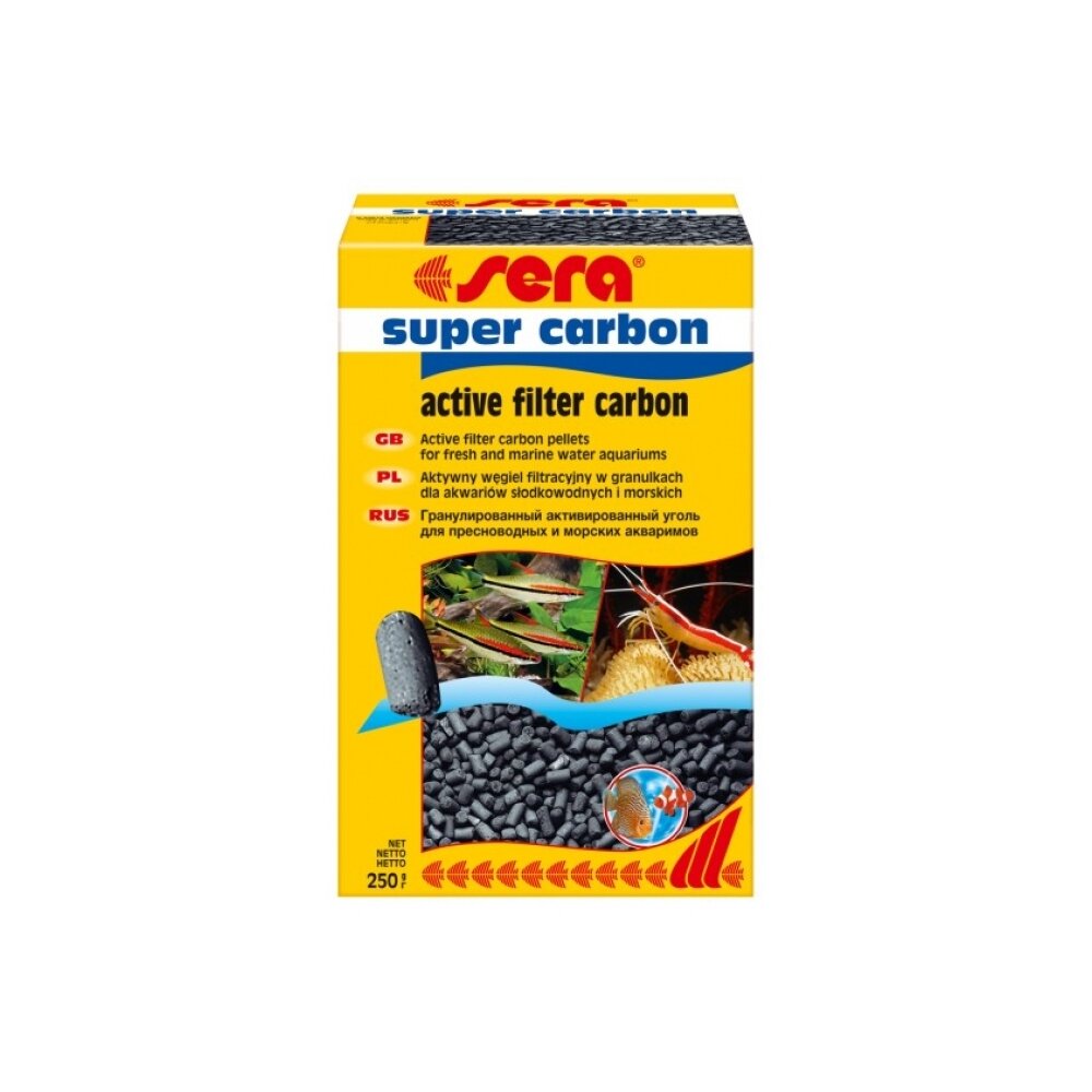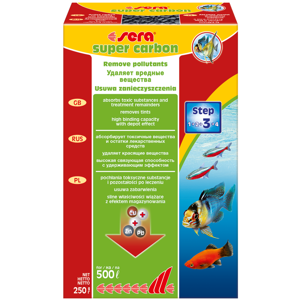 Специальный активированный уголь с высокой абсорбирующей активностью Sera Super Carbon быстро, эффективно, без побочных эффектов и не влияя на величину pH удаляет из воды остатки лекарственных средств. Использованный активированный уголь с абсорбированными опасными для окружающей среды веществами может быть без проблем выброшен вместе с домашним мусором без ущерба для окружающей среды. Кроме того, Sera Super Carbon замечательно подходит в случае острой интоксикации (например, при подозрении о занесении вредных веществ в процессе ремонтных работ в аквариуме и/или вместе с неподходящим декором, при передозировке лекарственных средств и пр.), а также для удаления придающих воде нежелательную окраску веществ. Не содержит фосфатов. Эффективен в течение длительного периода.
