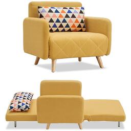 Универсальное, стильное и по-настоящему практичное приобретение. Мягкое и удобное кресло, которое трансформируется в односпальную кровать. Модель имеет стеганное сидение, округлые линии, ножки из светлого дерева, которые дополняют яркую обивку желтого цвета. Дополнительный аксессуар - небольшая подушка прямоугольной формы с акцентным геометричным принтом. Изделие представлено также в других цветах. Можно составить комплект из данного кресла и дивана из той же коллекции. Модель будет хорошо смотреться в интерьерах, оформленных в скандинавском стиле.