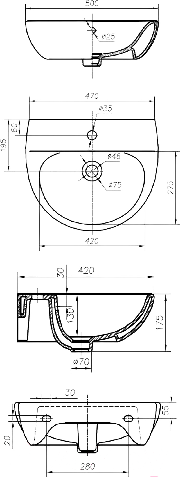 • Высота умывальника 17.5 см