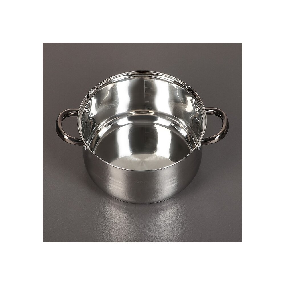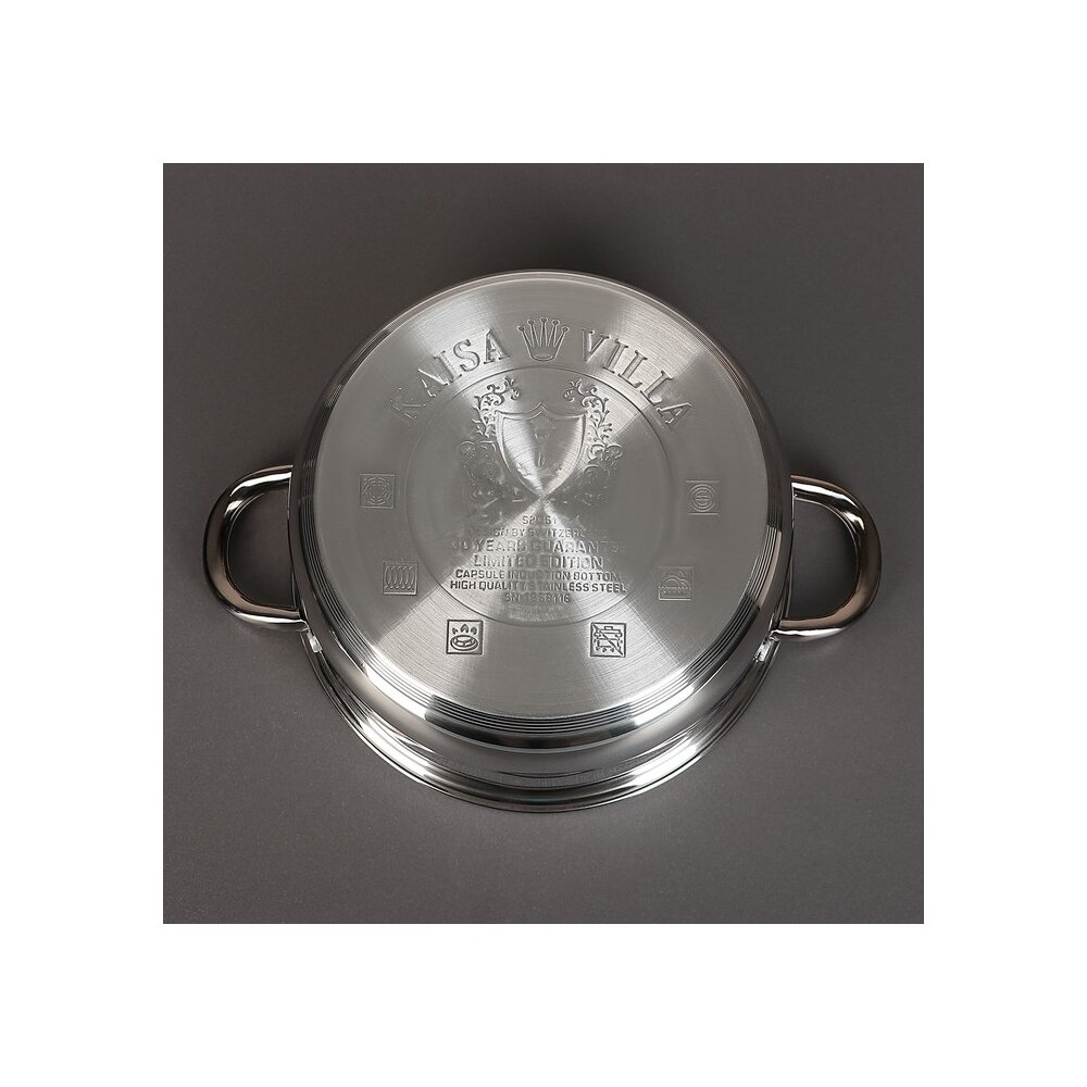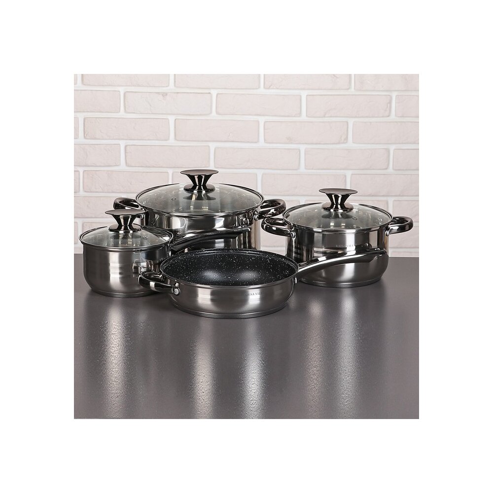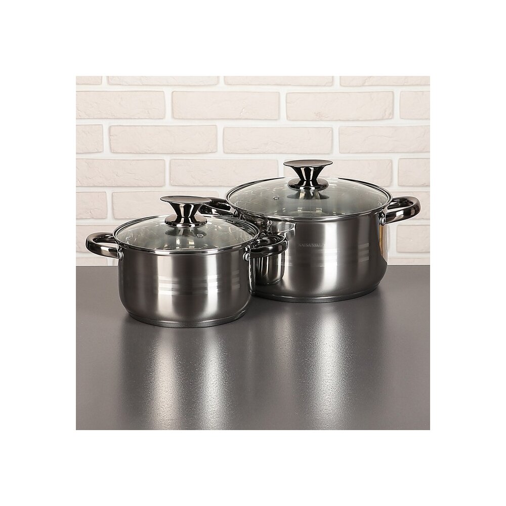 Набор посуды из нержавеющей стали поможет хозяйке готовить вкуснее и разнообразнее. Особенности изделий: 5-слойное капсульное дно; быстрое распределение тепла; высокопрочная сталь; большие и удобные ручки; мерные шкалы для дозирования продуктов. Изделия можно мыть в посудомоечной машине. Набор подходит для газовых и электрических, в том числе стеклокерамических, галогеновых, индукционных плит.