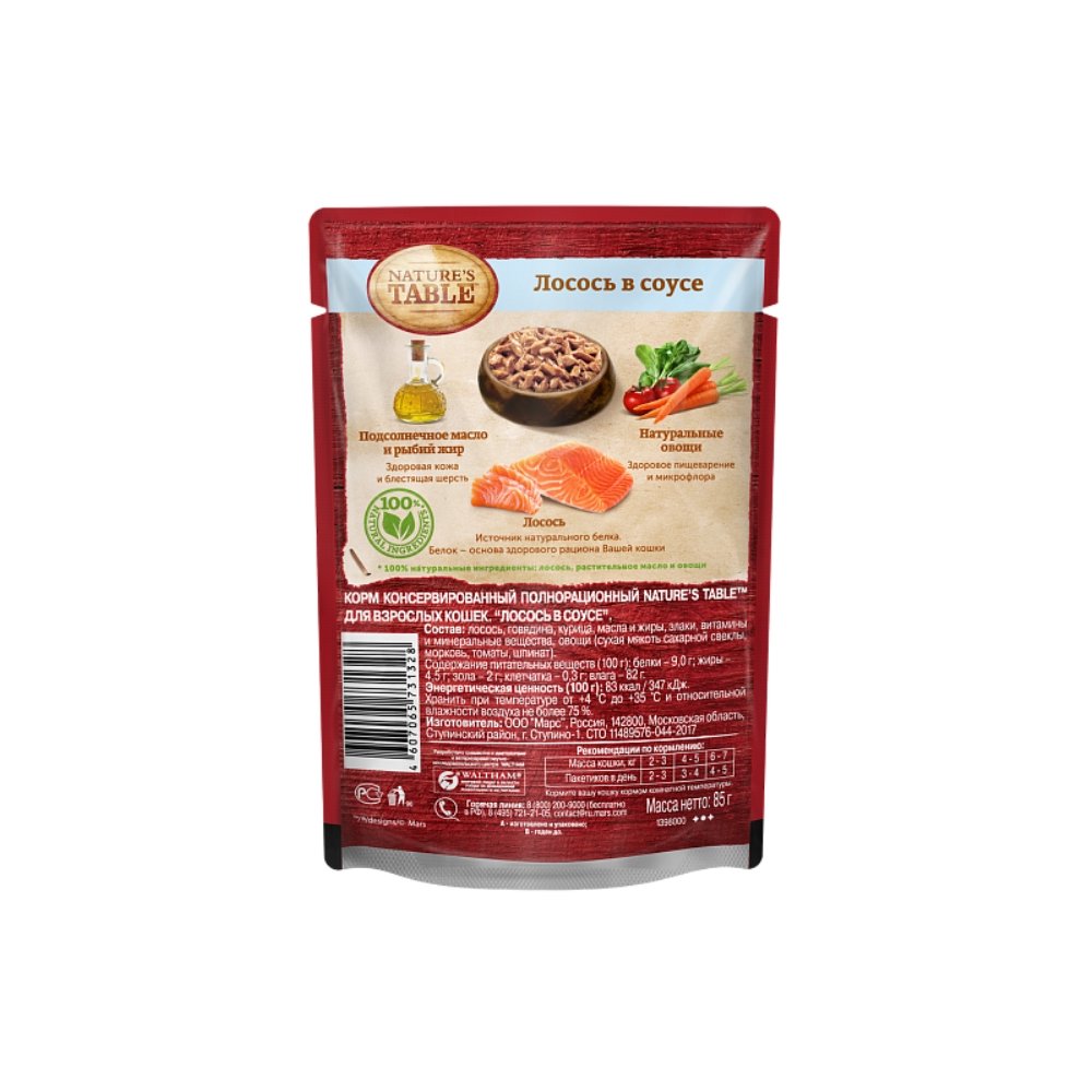 Рацион Nature`s Table Лосось в соусе содержит на 100% натуральные ингредиенты самого высокого качества, получаемые от проверенных поставщиков. Ингредиент № 1: лосось – богатый источник белка и жирных кислот омега-3, является основой здорового рациона кошки. Подсолнечное масло и рыбий жир – источники омега-3 и омега-6 кислот, витаминов А, D, E для естественного здоровья кожи и блестящей шерсти. Натуральные овощи и злаки – источники углеводов и клетчатки, витаминов и минералов для здорового пищеварения, улучшения микрофлоры кишечника. Корм не содержит сои, искусственных красителей, усилителей вкуса и консервантов.
