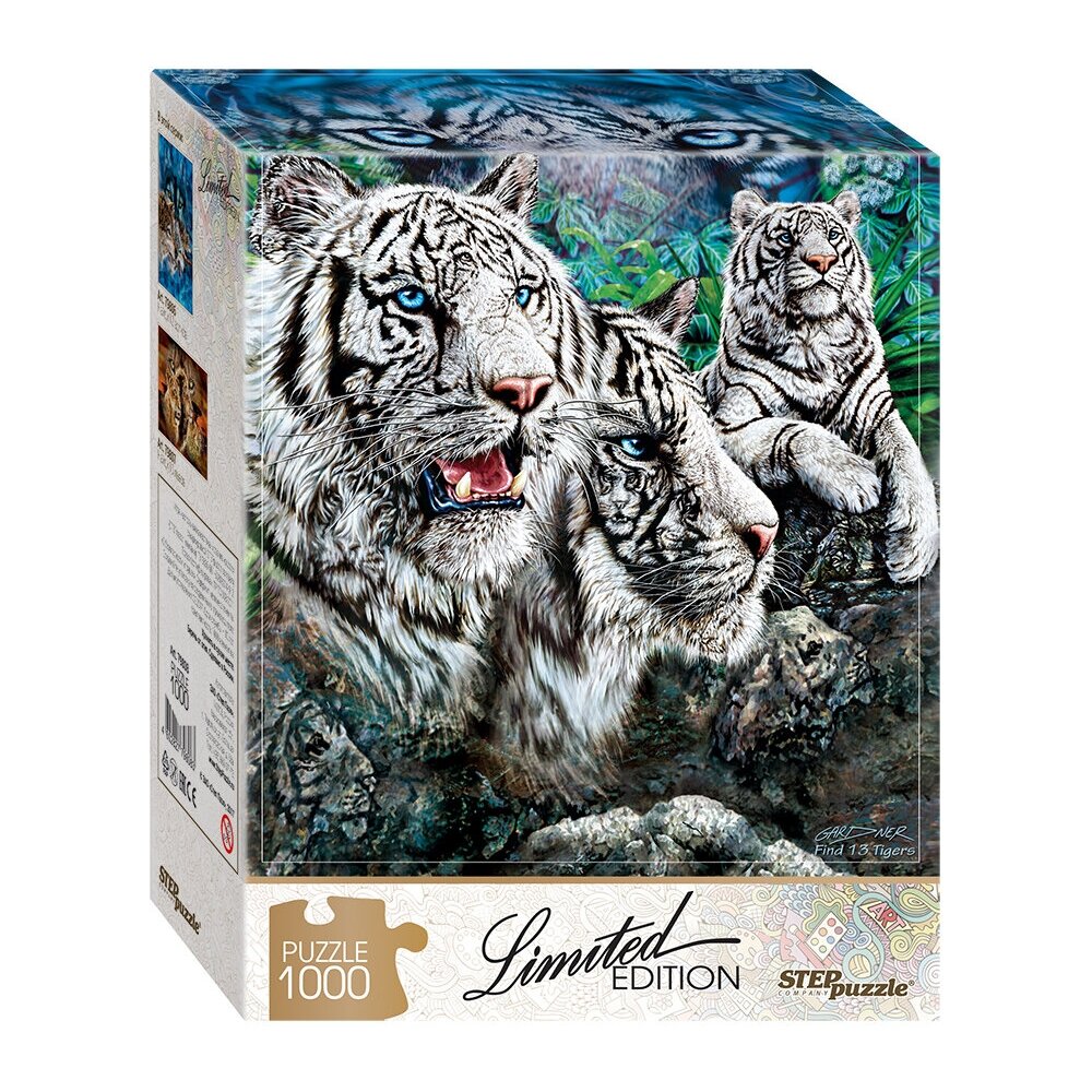 Пазл «Найди 13 тигров» из серии Limited edition состоит из 1000 элементов. Загадочная картина калифорнийского художника Стивена Гарднера надолго увлечёт вас и вашего ребёнка. Соберите пазл и постарайтесь найти всех белых тигров. Камни, полосатый узор шерсти — отыскать нужные детали будет непросто.<p>Картонный пазл отличается ярким и чётким изображением, уникальной формой деталей, точностью подгонки. Изготовлен из высококачественных, нетоксичных материалов. Пазл понравится взрослым и детям.</p>