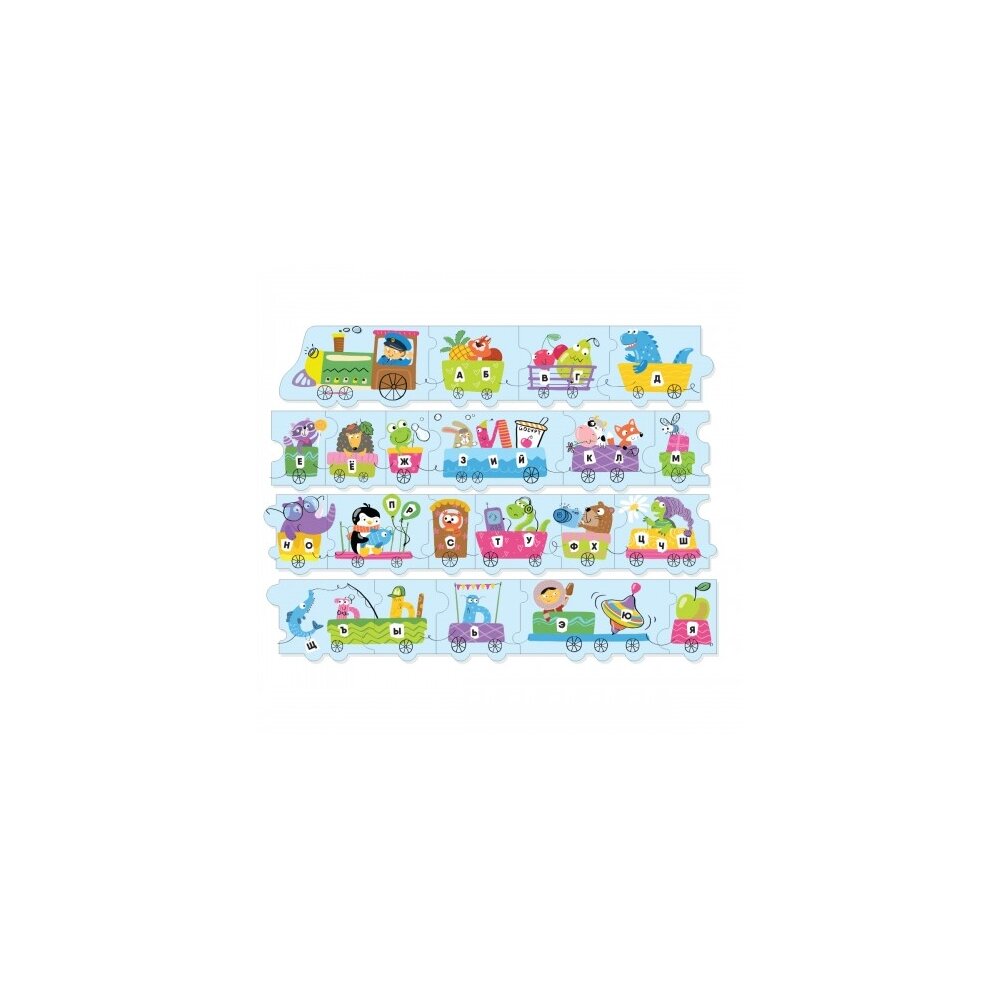 "Каждый заботливый родитель мечтает научить малыша читать до того, как он пойдет в школу. Такой сложный материал детям желательно преподносить в игровой форме. Для этого как нельзя лучше подойдет Пазл Паровозик ""Алфавит"". Он интересен тем, что его детали складываются не в прямоугольную картину, а в длинную линейку. Так как на каждом элементе игры нарисован яркий вагончик, то в сложенном состоянии пазл принимает форму красочного паровозика. Малышу будет очень интересно разглядывать пассажиров поезда. Ведь в нем находятся не только люди, а также звери, фрукты и предметы.<br />Кроме того на вагонах написаны буквы русского алфавита. Чтобы малышу было легче их запомнить, вагончик везет предмет, который начинается на эту букву.<br />Чтобы составить весь алфавит ребенку необходимо складывать пазлы таким образом, чтобы буквы на вагончиках располагались по порядку.<br />В процессе игры малыш не только будет изучать внешний вид букв, но и запоминать их порядок в алфавите.".
