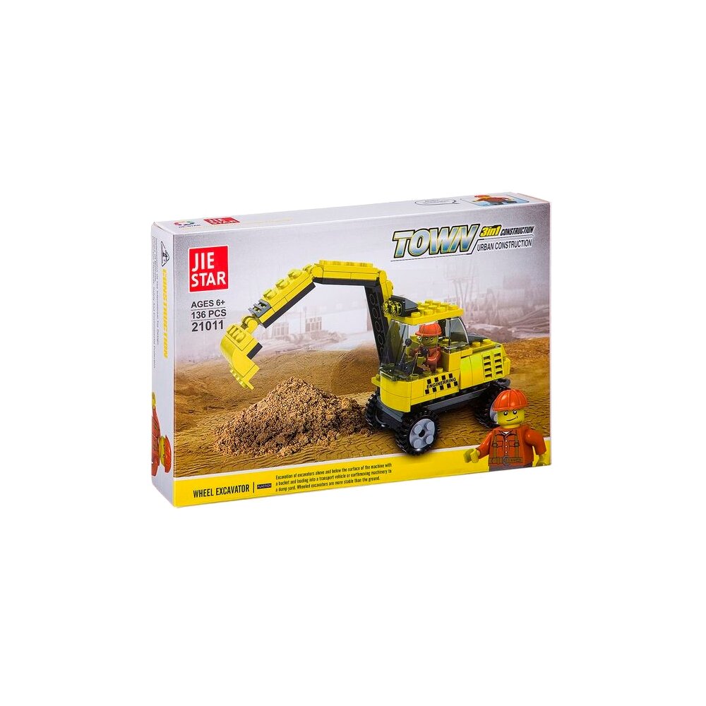 Конструктор состоит из 136 пластиковых деталей разных форм. Юному инженеру предстоит собрать яркий экскаватор с крепким корпусом, прозрачной кабиной, стрелой с ковшом, крутящимися колесами. В кабину помещается фигурка водителя. Мальчик будет увлечен сначала сборкой специальной техники, а потом и игрой в стройку.