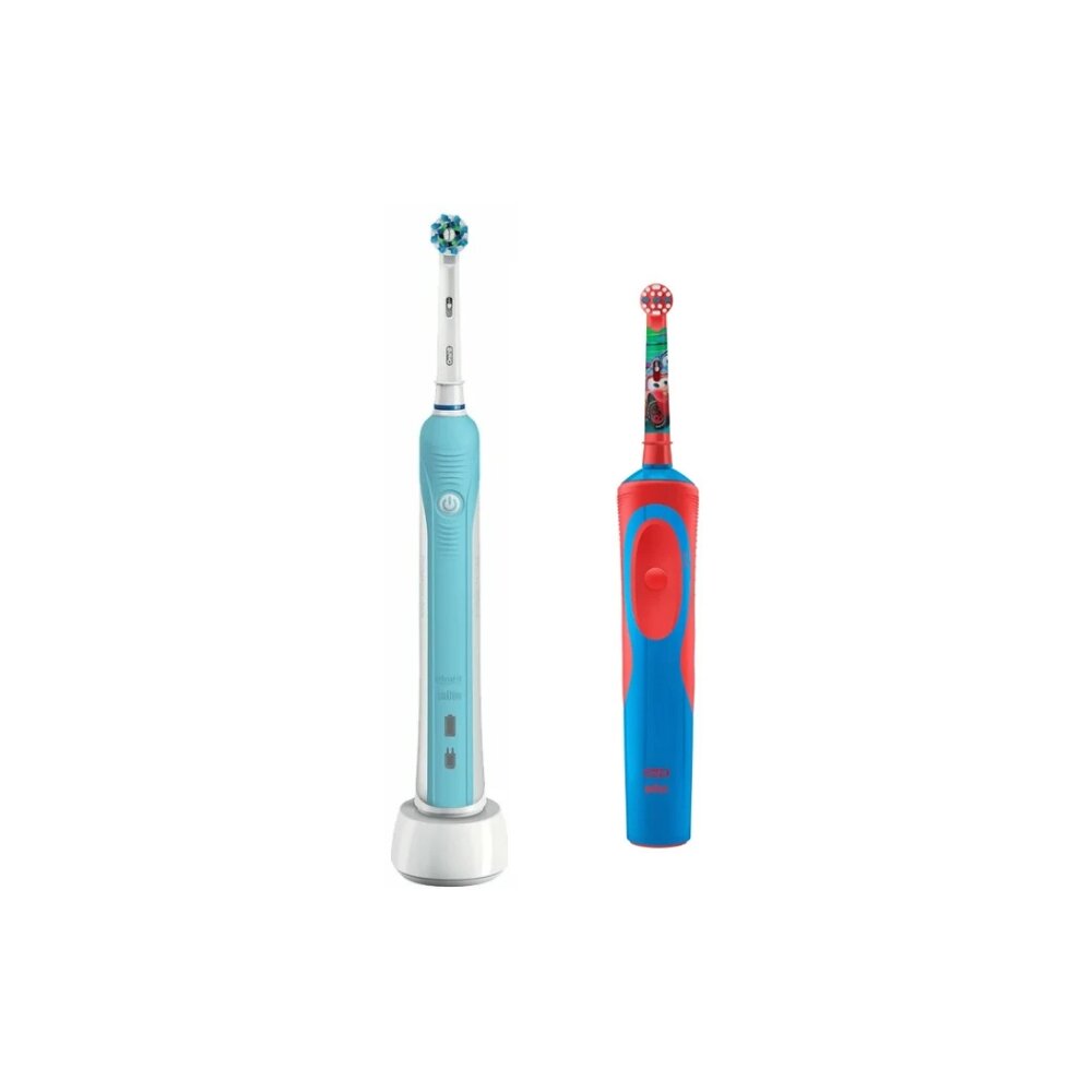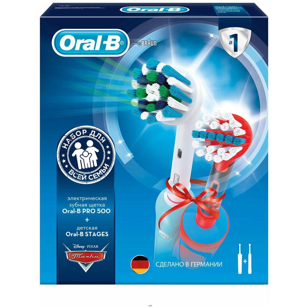 Oral-B — марка зубных щёток № 1, используемая большинством стоматологов мира! Перейдите на новый уровень чистки за 2 минуты в соответствии с рекомендацией вашего стоматолога. Набор электрических зубных щёток Family Pack — Oral-B PRO 500 и Oral-B Stages Power Cars. Профессиональный 2-минутный таймер Oral-B PRO 500 уведомляет каждые 30 секунд о необходимости сменить зону чистки зубов. Сенсорный датчик давления замедляет движение щётки, когда вы оказываете чрезмерное давление. Oral-B Stages Power Kids с весёлыми героями мультфильма «Тачки» прекрасно чистит зубы и удобно ложится в маленькие ручки ребёнка.