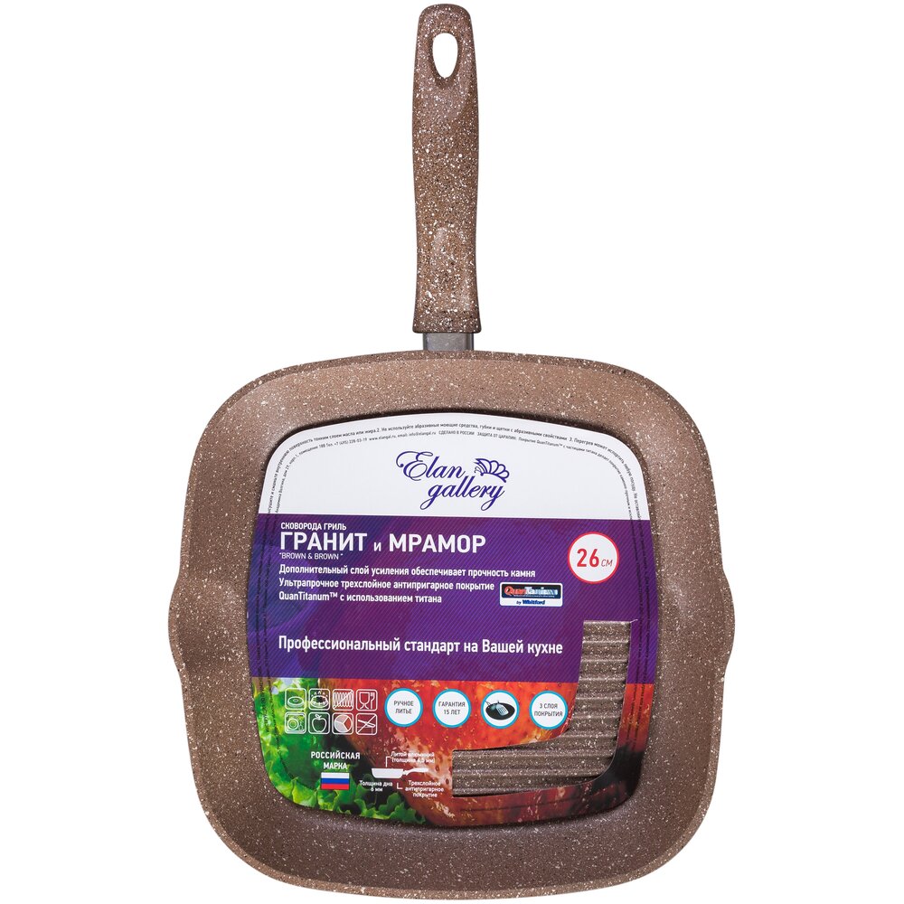 Сковорода-гриль 26х26 см серии «Гранит» - это современная посуда российского производства с ультра прочным трехслойным антипригарным покрытием, усиленным частицами титана. Уникальное антипригарное покрытие QuanTanium — инновация от ведущего разработчика антипригарных покрытий Whitford. Покрытие QuanTanium имеет исключительную коррозионную и механическую стойкость, абразивную устойчивость на истирание 8-10 тысяч циклов! Покрытие QuanTanium экологически чистое, не содержит тяжелых металлов, выполнено на водной основе и не взаимодействует с готовящимися продуктами. Корпус посуды изготовлен из литого пищевого алюминия толщиной 6 мм, что обеспечивает высокую термостойкость. Утолщенные стенки и дно равномерно распределяют тепло и экономят время приготовления пищи. Дно посуды крашеное, что облегчает уход. Сковороды можно использовать на газовых, электрических и стеклокерамических плитах. Бакелитовые ручки не нагреваются и не скользят. Несъемная ручка имеет покрытие Soft-Touch. Гарантия на посуду составляет 15 лет!.