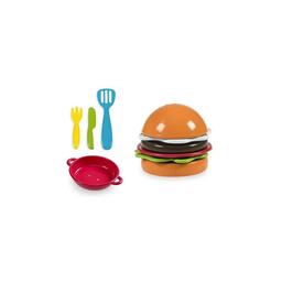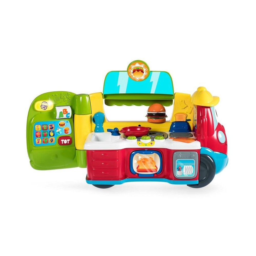 Двуязычная обучающая игрушка-автобус, который превращается в кухню и наоборот. Кухня оснащена множеством элементов: варочная панель и 2 конфорки, которые издают реалистичные звуки и забавные мелодии, раковина (нажмите на кран и вы услышите звук льющейся воды и весёлую песенку), открывающаяся духовка, аксессуары для приготовления бутерброда (вилка, нож, лопатка, тарелка). При включении фургон произносит: «Грузовичок с едой приехал». После игры и приготовления пищи опустите вывеску, закройте заднюю дверь и автомобиль готов отправиться навстречу приключениям. Во время движения активируются реальные звуки автомобиля. На двери фургона расположена электронная касса, после приготовления пищи ребёнок может подсчитать сумму заказа и выписать чек, нажав на красную кнопку «TOT». При нажатии активируются звуковые и световые эффекты. Игрушка произносит более 50 слов, реалистичных звуков и забавных мелодий на русском и английском языках.