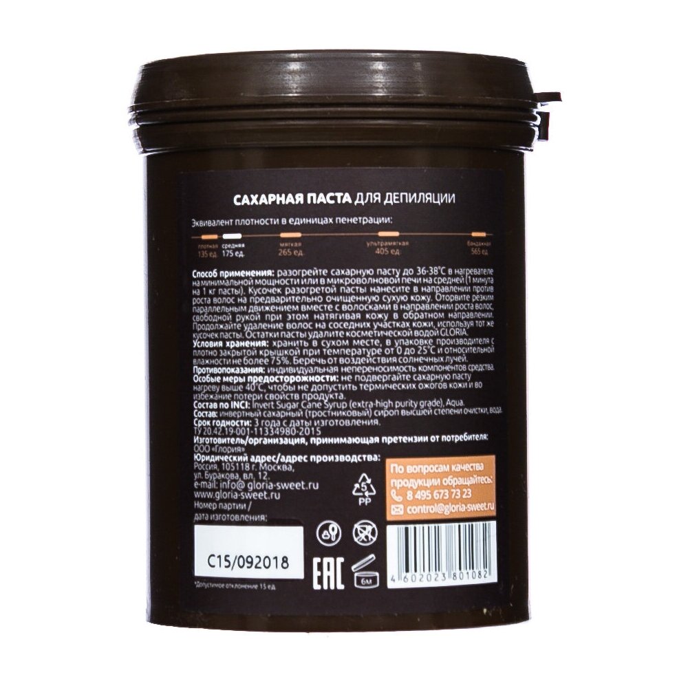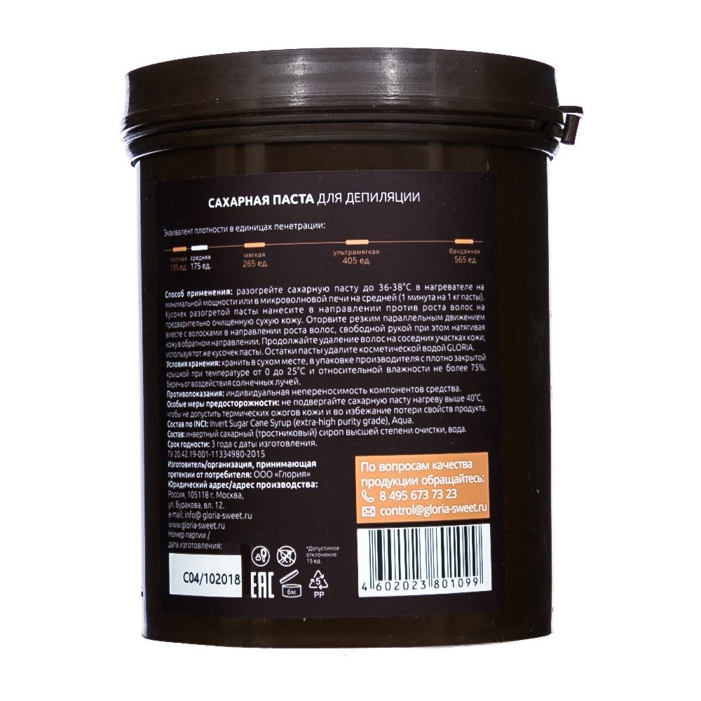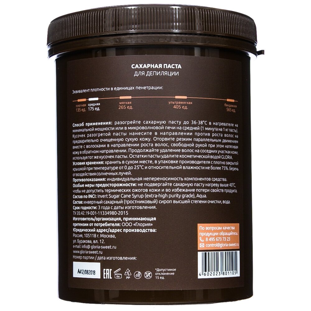 Профессиональная сахарная паста от ведущего российского производителя Gloria соответствует самым высоким стандартам качества за счёт инструментального контроля на всех этапах производства продукции. Благодаря натуральному составу паста абсолютно безопасна и гипоаллергенна, а благодаря особой формуле и современному оборудованию стабильна в работе, эффективно удаляет даже короткие волосы и не теряет своих свойств на протяжении всей процедуры.