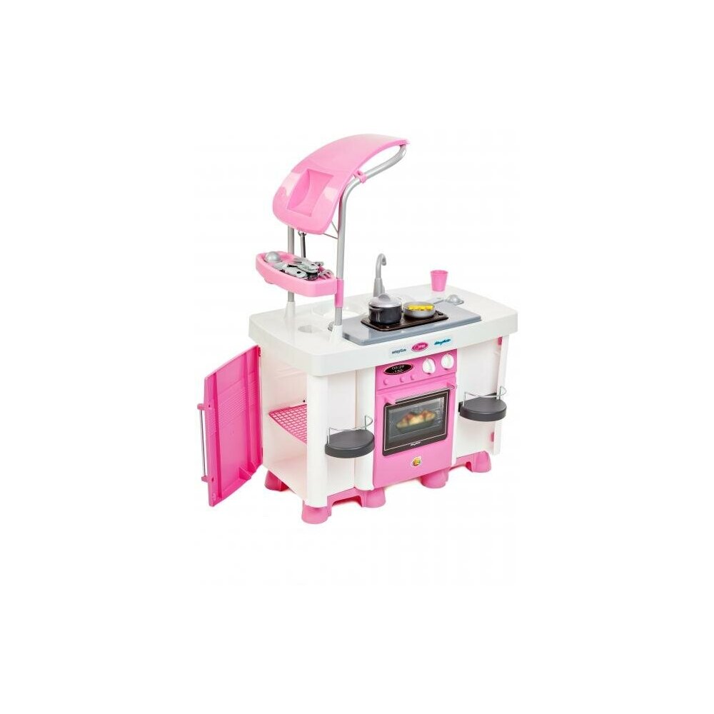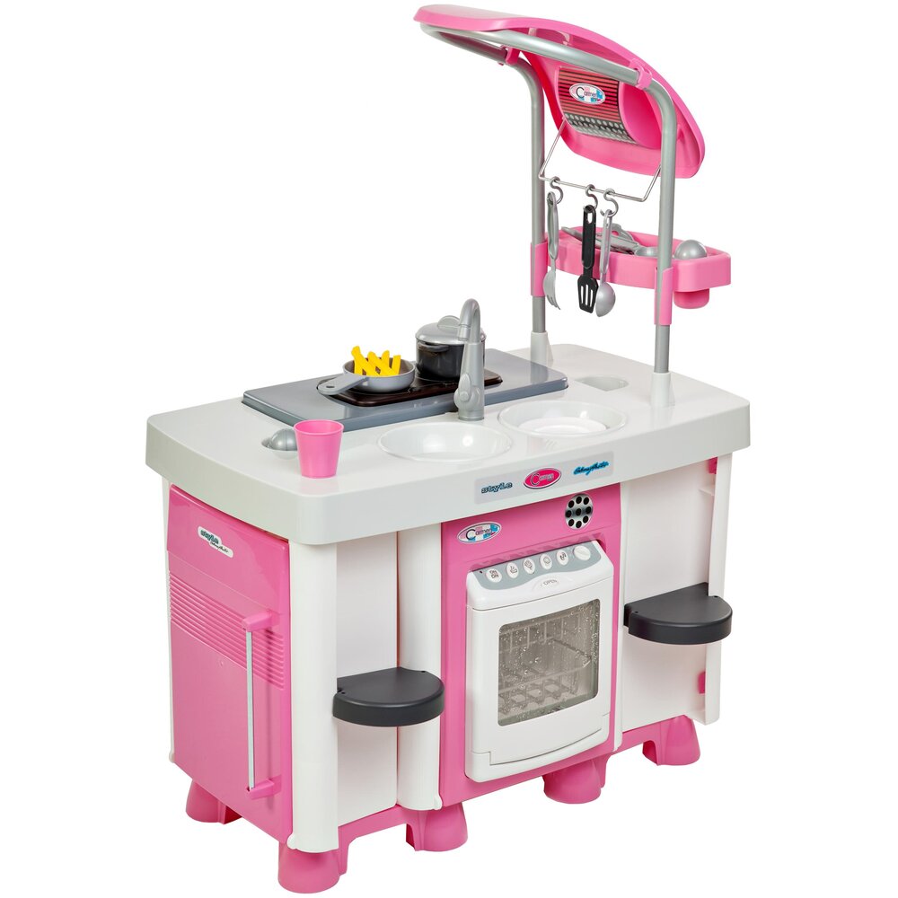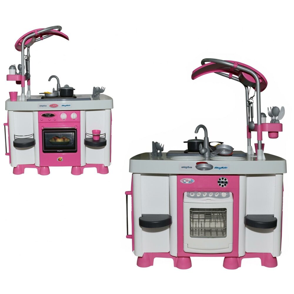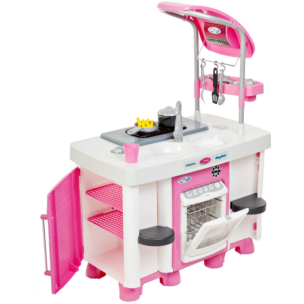 - В комплекте игрушечная еда, духовой шкаф, вытяжка, кухонная утварь, раковина, посуда, посудомоечная машина, плита