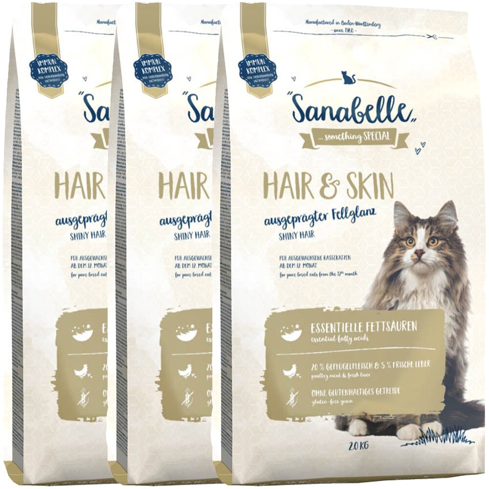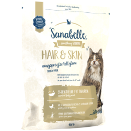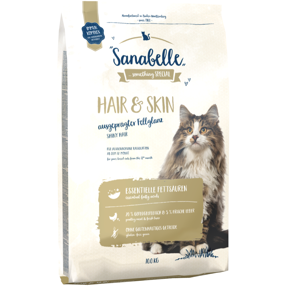 Полнорационный корм для взрослых кошек - поддерживает здоровье кожи и шерсти. Корм для кошек, которым необходимы особое внимание и уход за кожей и шерстью. Благодаря оптимальному соотношению полиненасыщенных жирных кислот (омега-3 и омега-6) рацион Sanabelle HAIR amp; SKIN устраняет шелушение кожи, делает шерсть более гладкой и блестящей. Специальный комплекс витаминов и минералов, а также высочайшее качество белка, главным источником которого является свежее мясо птицы, улучшают структуру шерсти и снижает интенсивность бесконтрольной линьки.
