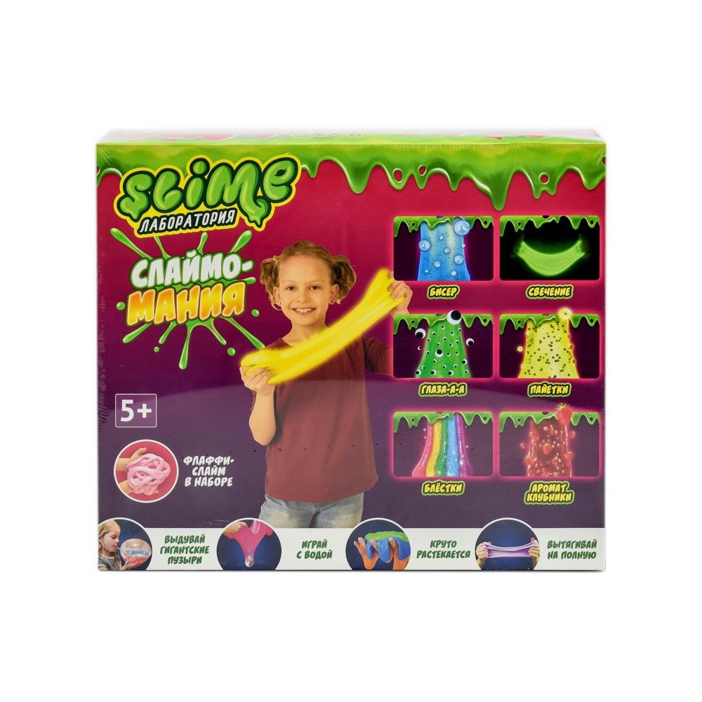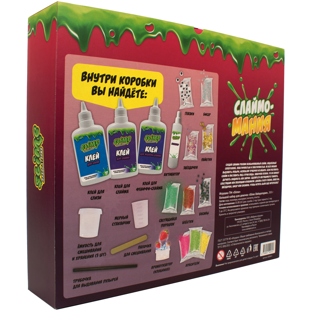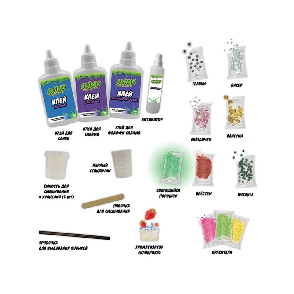 - Комплектация - инструкция;<br/> - флакон с клеем для слайма;<br/> - флакон с клеем для слизи;<br/> - флакон с клеем для флаффи-слайма;<br/> - флакон с активатором;<br/> - три емкости для смешивания;<br/> - мерный стаканчик;<br/> - трубочка для пузырей;<br/> - палочка для размешивания;<br/> - три красителя (розовый, зеленый, желтый);<br/> - светящийся порошок;<br/> - золотые блестки;<br/> - ароматизатор «Клубника;<br/> - звездочки;<br/> - бусины;<br/> - пайетки;<br/> - бисер;<br/> - пластиковые глазки.