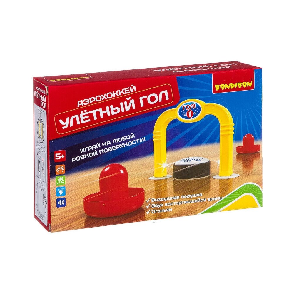 Ребенок любит аэрохокей, а разместить дома специальный стол нет возможности Подарите ему игру Улетный гол от Bondibon. Благодаря специальной технологии играть можно на любой гладкой поверхности. При успешном попадании вы услышите звук восторженных болельщиков и увидите мерцающий огонек на воротах соперника.