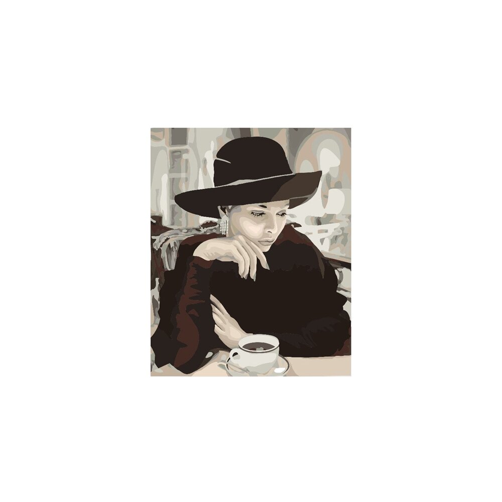 На предлагаемой картине запечатлена молодая женщина, ожидающая кого-то за столиком. Задумчивый взгляд устремлён вдаль. На столике стоит чашка недопитого кофе. Женщина одета в элегантное чёрное платье. На голове — шляпа с широкими полями. Картина выполнена в чёрно-белых тонах и их оттенках.