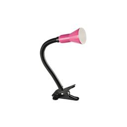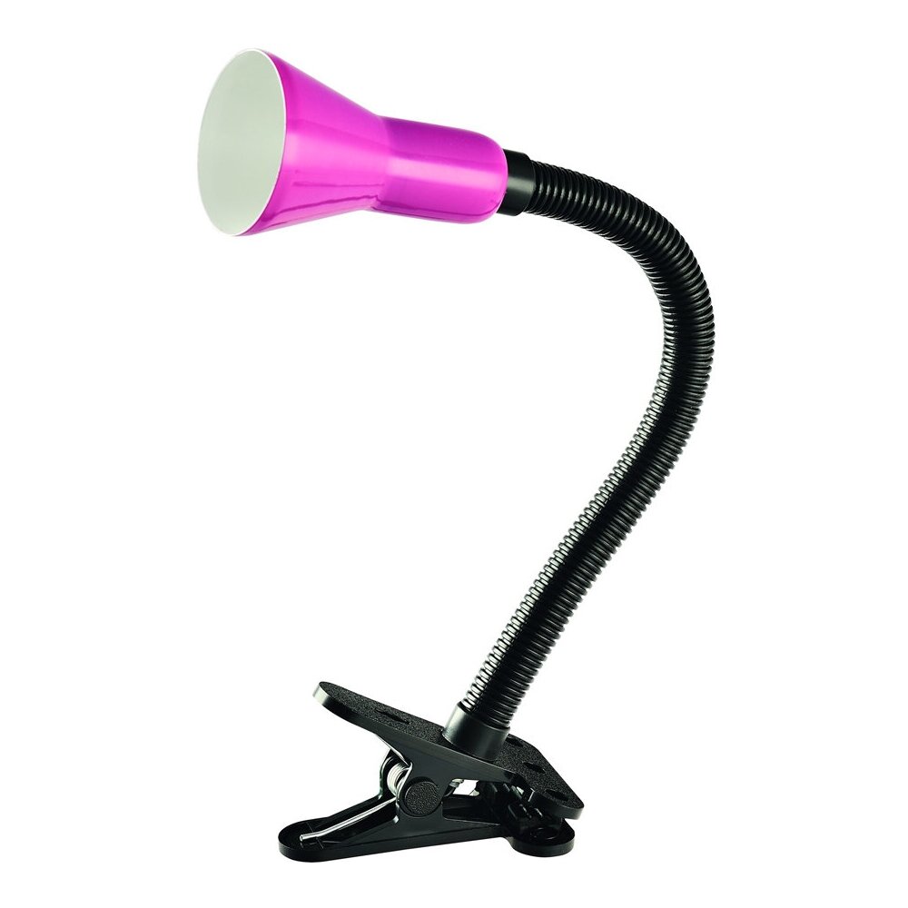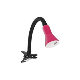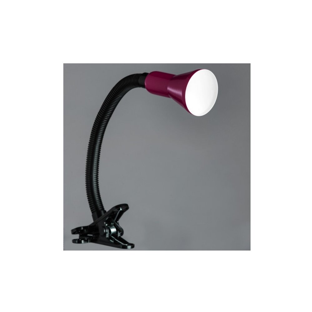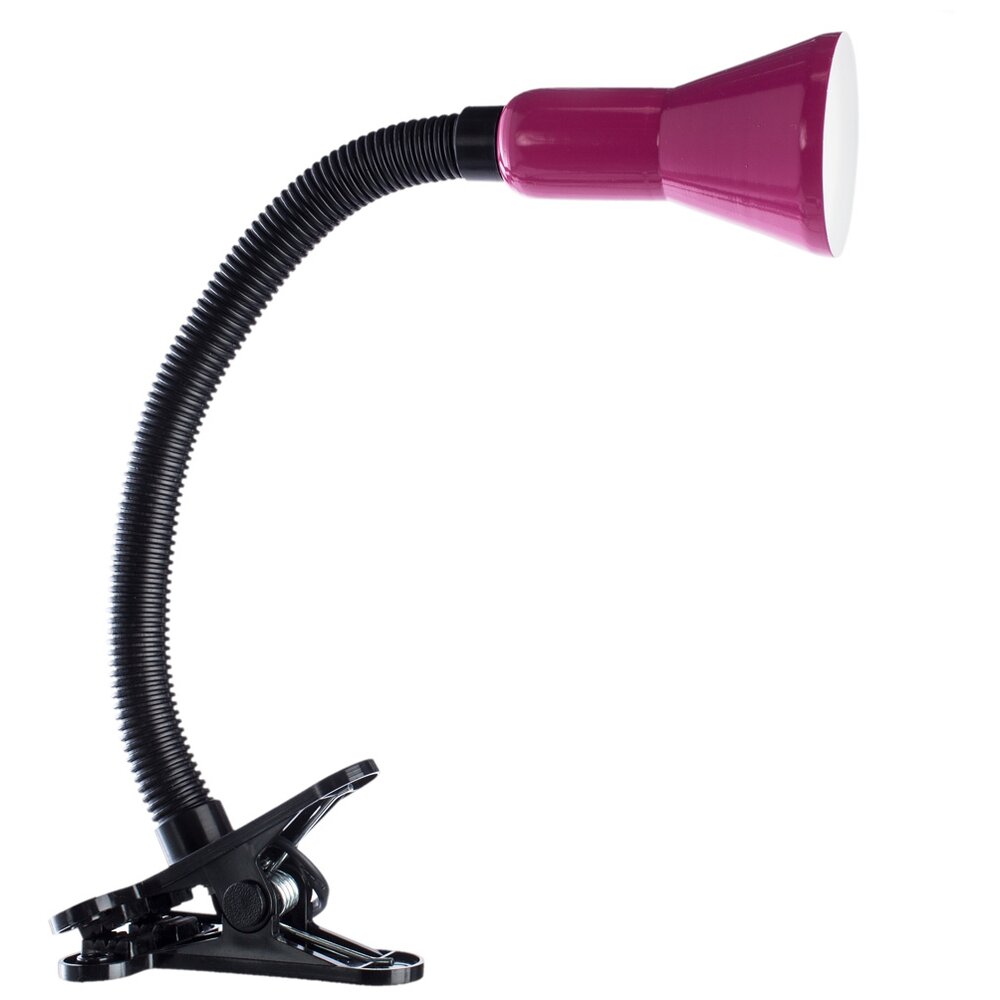 Настольный светильник на прищепке выполнен в современном стиле с металлической арматурой, пластиковой гофрой чёрного цвета и конусовидным металлическим плафоном розового цвета (внутри цвет белый). Модель поможет организовать локальное освещение на рабочем месте, с помощью регулируемой арматуры есть возможность направить световой поток в нужную сторону. Настольная лампа удачно впишется в интерьер рабочего кабинета или офиса в стиле хай-тек.