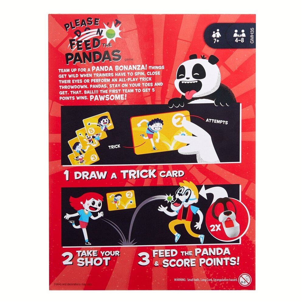 Панды и их тренеры готовы продемонстрировать трюки и заработать очки в увлекательной игре «Покорми панду»! Панды голодны, но чтобы получить желаемое лакомство, им придётся постараться. Один из игроков надевает маску панды с открытым ртом и готовится ловить еду — шарики. Другой игрок (тренер) будет кормить панду. Сложность заключается в том, что тренеру нужно не просто бросать шары, а делать это из неудобных позиций: через плечо, при повороте, с закрытыми глазами и т. п. Это определяет карта, которую тренер вытаскивает перед броском. Команда, набравшая первой 5 очков, выигрывает! Рекомендуется для 4–8 игроков в возрасте от 7 лет. Игра развивает крупную моторику, ловкость, выносливость, концентрацию, скорость реакции. Предупреждение: существует опасность удушения, так как игрушка содержит маленький шарик. Не предназначено для детей младше 3 лет.