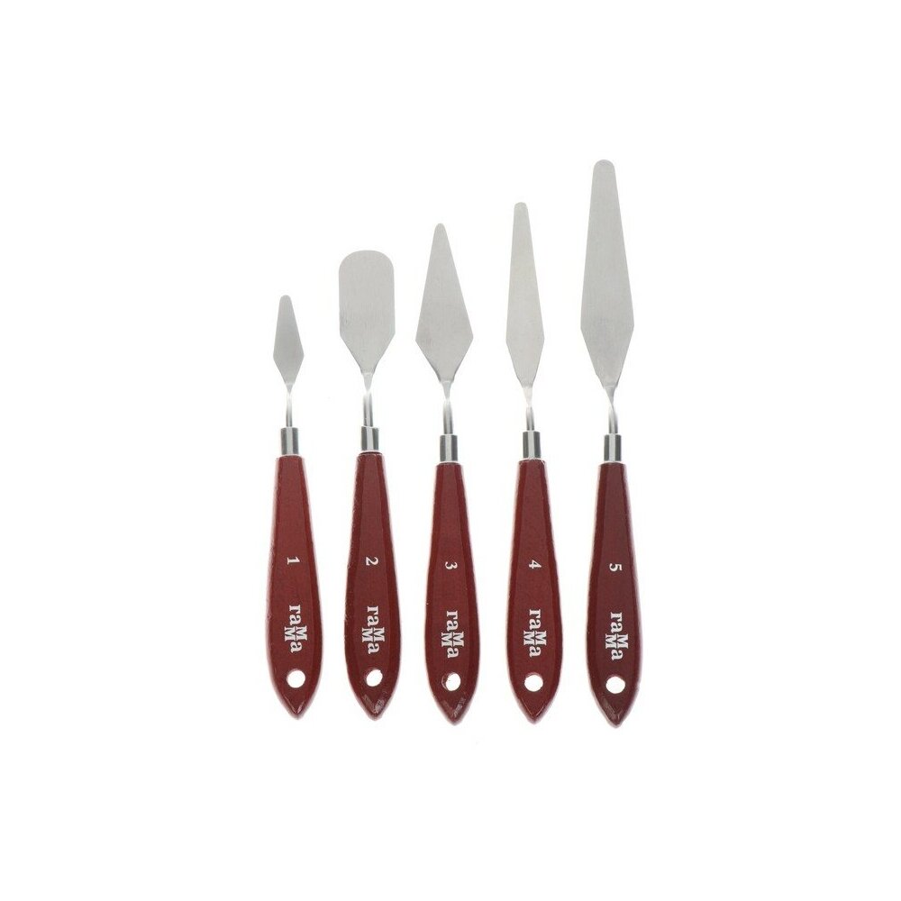 5 мастихинов в наборе для профессиональных художников. Предназначены для художественных работ масляными и акриловыми красками. Выполнены из нержавеющей стали, кованные, с ручкой из натурального дерева. Удобная коробка для хранения.