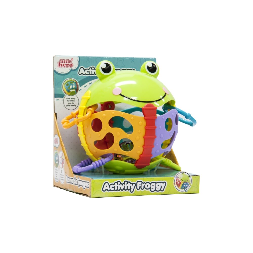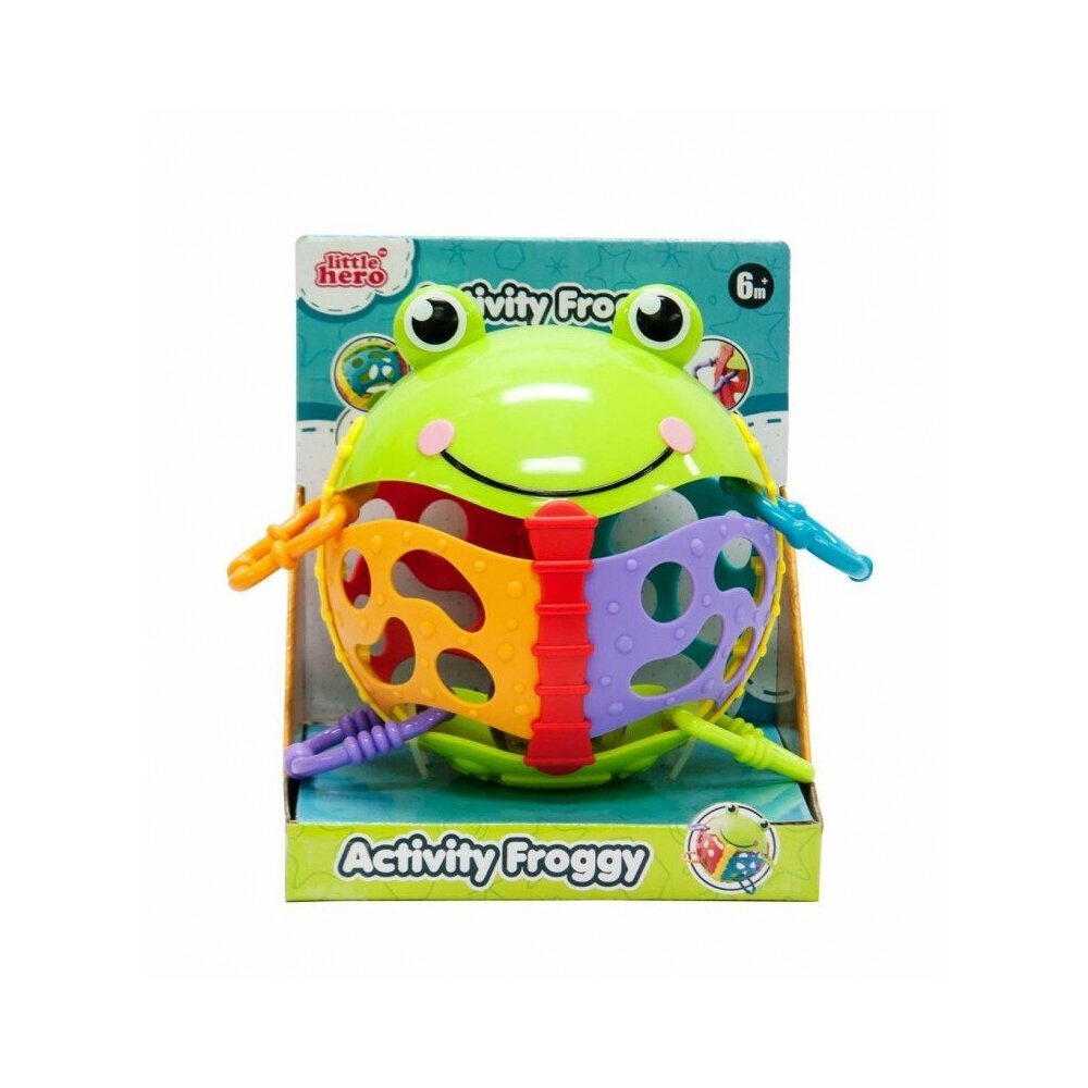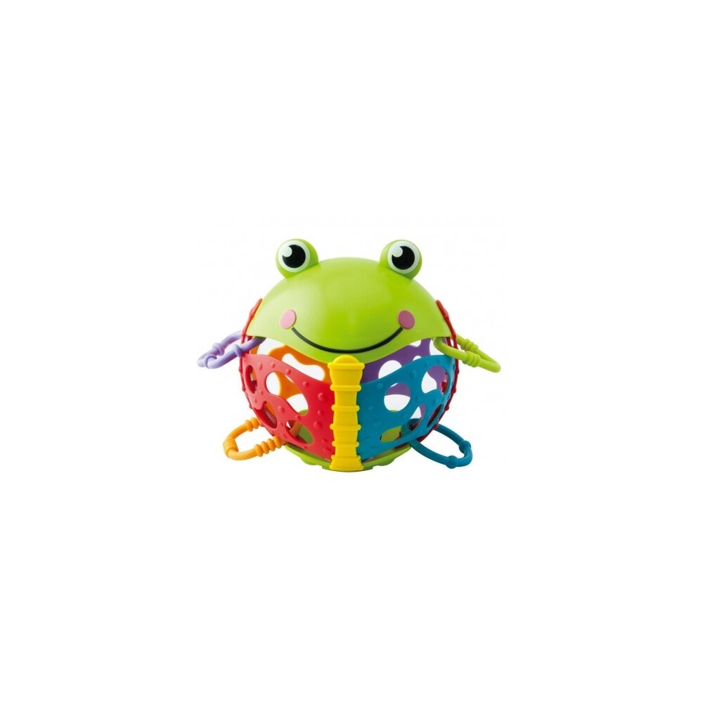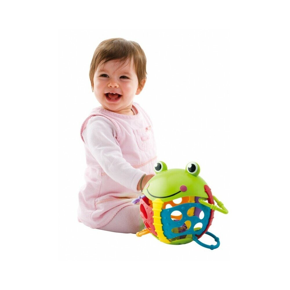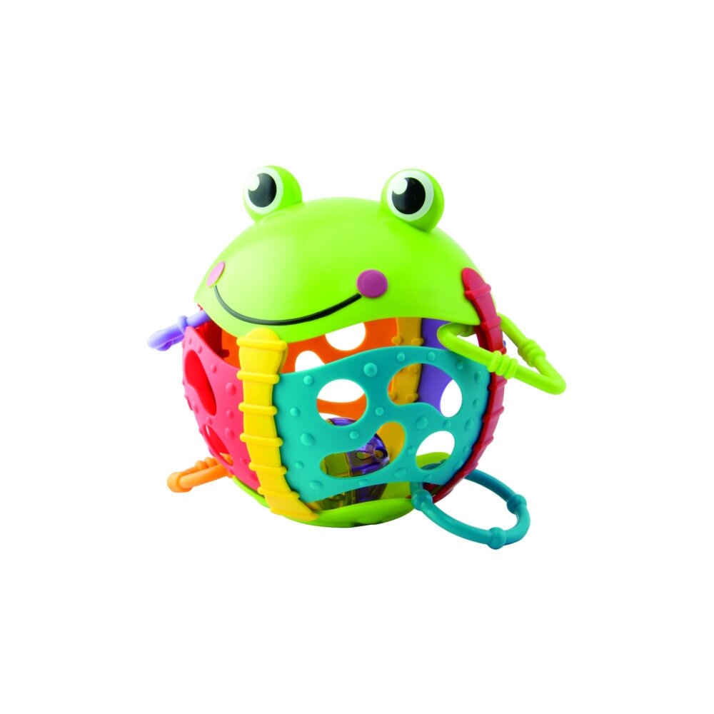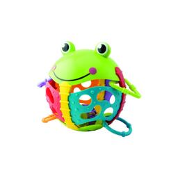 Внутри игрушки спрятан шарик-погремушка, который издаёт забавные звуки, когда малыш трясёт лягушонка. Погремушка выполнена из мягкого гибкого пластика. 4 разноцветных рельефных колечка способствуют развитию моторики малыша.