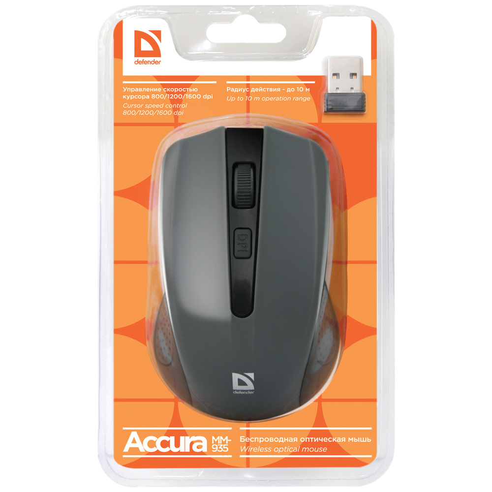 Беспроводная оптическая мышь Defender Accura MM-935<br />сверхстойкое прорезиненное покрытие «Soft Touch».<br />Специальное нескользящее покрытие приятно на ощупь и предотвращает скольжение мыши в руках.<br />- 2 батарейки ААА в комплекте.<br />Мышь оснащена автоматической системой экономии энергии и переходит в режим энергосбережения ("засыпает"), если не используется.<br />радиус действия - 10 м обеспечивает большую свободу действий.<br />3 режима разрешения мыши 800/1200/1600 dpi.<br />Кнопка смены разрешения позволяет менять скорость курсора мыши одним нажатием (800/1200/1600 dpi).<br />удобная симметричная форма мыши подходит для работы любой рукой.