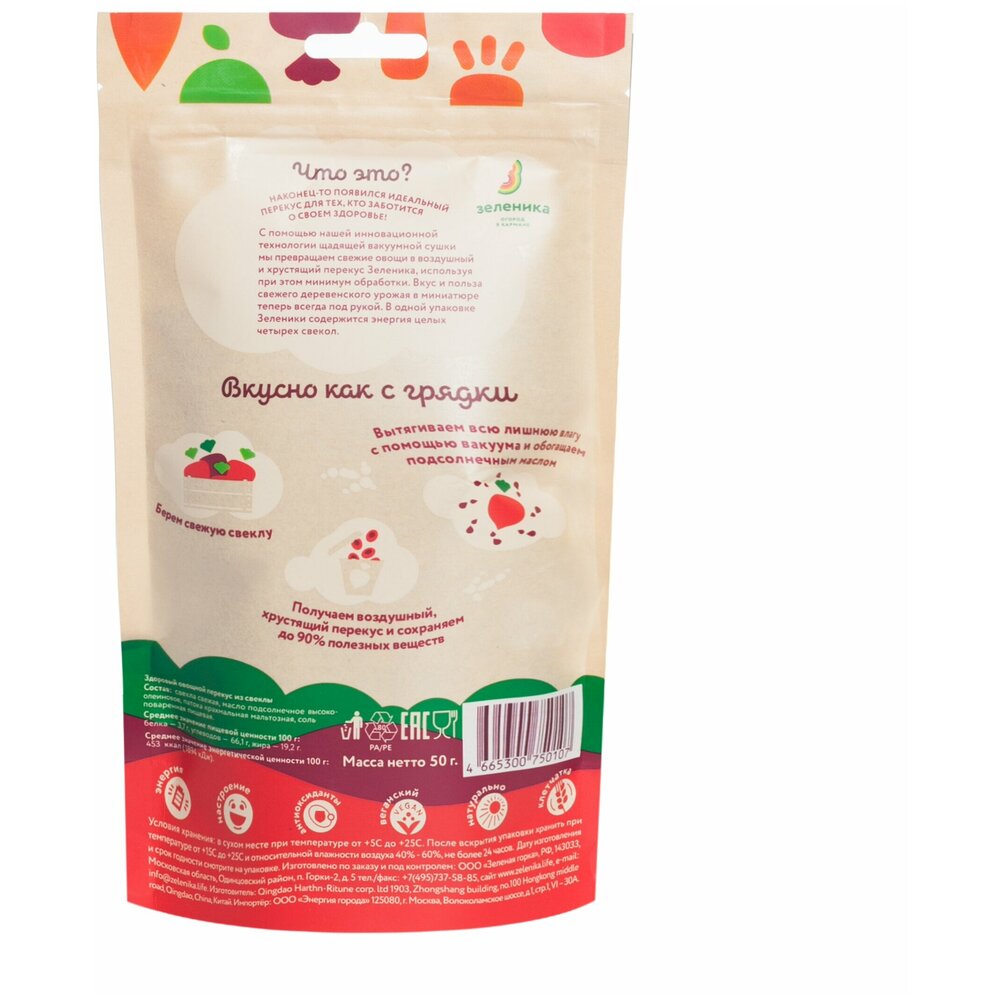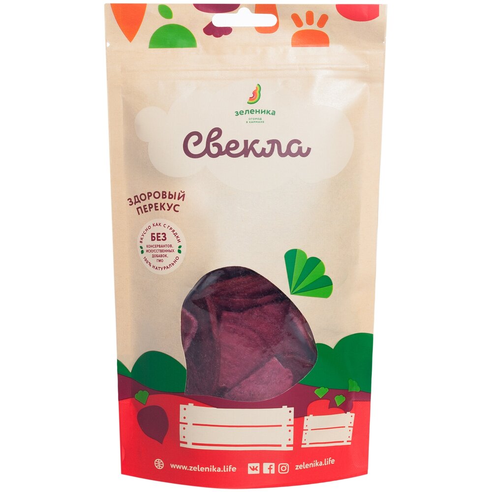 В одной упаковке «Зеленики» — 350 г очищенной и порезанной свежей свёклы. Технология вакуумной сушки позволяет поместить это количество в 50-граммовую упаковку, сохранив питательные свойства свежего продукта.